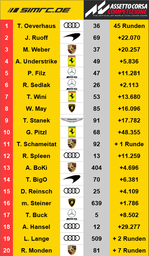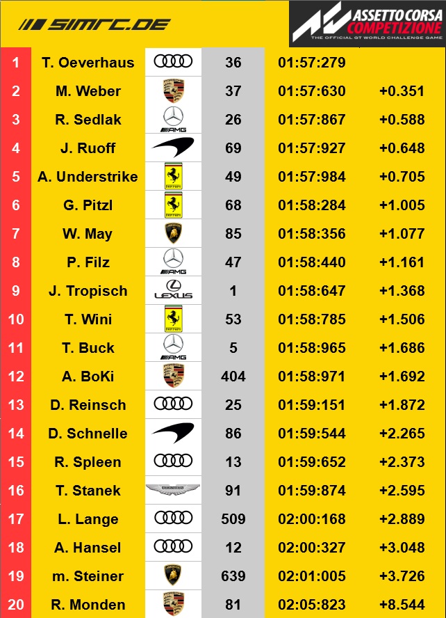 Überraschenderweise fanden sich unsere Fahrer in der Qualifikation bei völliger Dunkelheit wieder. Eine Fehlkonfiguration am Server brachte uns ein Nacht-Quali mit fröstelnden 9°C Luft- und Streckentemperatur. Was am Anfang für Verwirrung sorgte, zeigte in der Folge durch niedrige Temperaturen sehr schnelle Rundenzeiten. Nach viel Reibereien um die besten 5 Plätze konnte sich am Ende Oeverhaus im Audi R8 klar vor Weber im Porsche 991 II und Sedlak im Mercedes AMG durchsetzen. Filz im Mercedes AMG holte mit P8, gemessen am Teamkollegen Sedlak und Hauptkonkurrenten Weber, ein eher ernüchterndes Ergebnis.