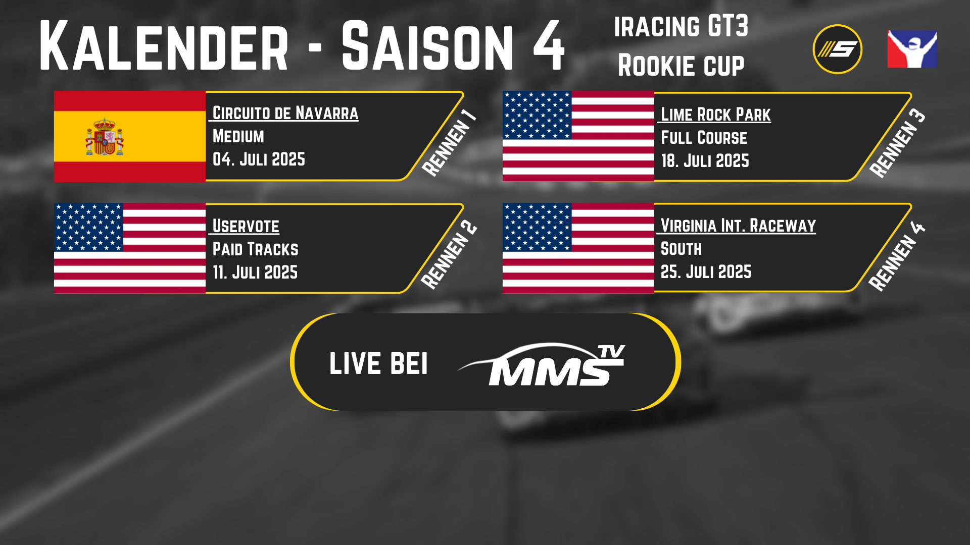 Auch die 4. Saison soll sich wieder an Liganeulinge, Anfänger oder Enthusiasten richten. Das bedeutet bis zur 2000 iRating Grenze sind alle willkommen und können um den Titel und Startplätze in der GT3 Meisterschaft fahr
