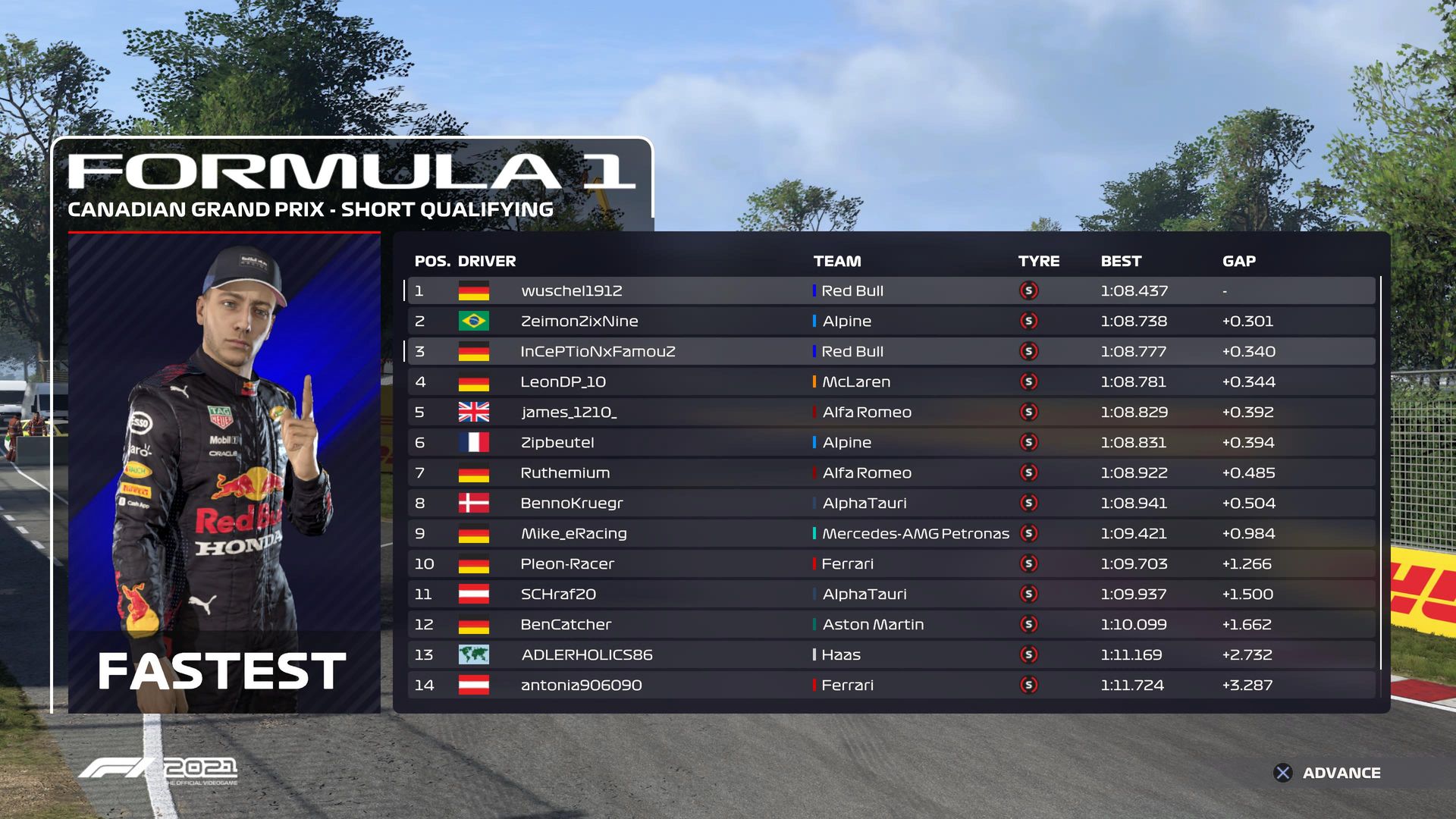 HR: Guter Start und mit Mike_eRacing in Kurve 1 und 2 gefahren. Habe mich in der 6. Kurve verbremst und berührte mein Teamkollegen, der sich zum Glück nicht gedreht hat so wie ich. Somit war ich letzter und musste aufholen. Das SC hat mir bei der Aufholjagd sehr geholfen. Hatte im Laufe des Rennens paar Kämpfe mit Adlerholic86, Mike_eRacing, @BennoKruegr und @BenCatcher (finde vom Ben und Benno das @ nicht) Ich denke ich bin diesmal sauberer gefahren als in Russland in F1 2020! Hatte leider paar front Flügel Stopps wegen der Wall of fame oder wie die heißt :)