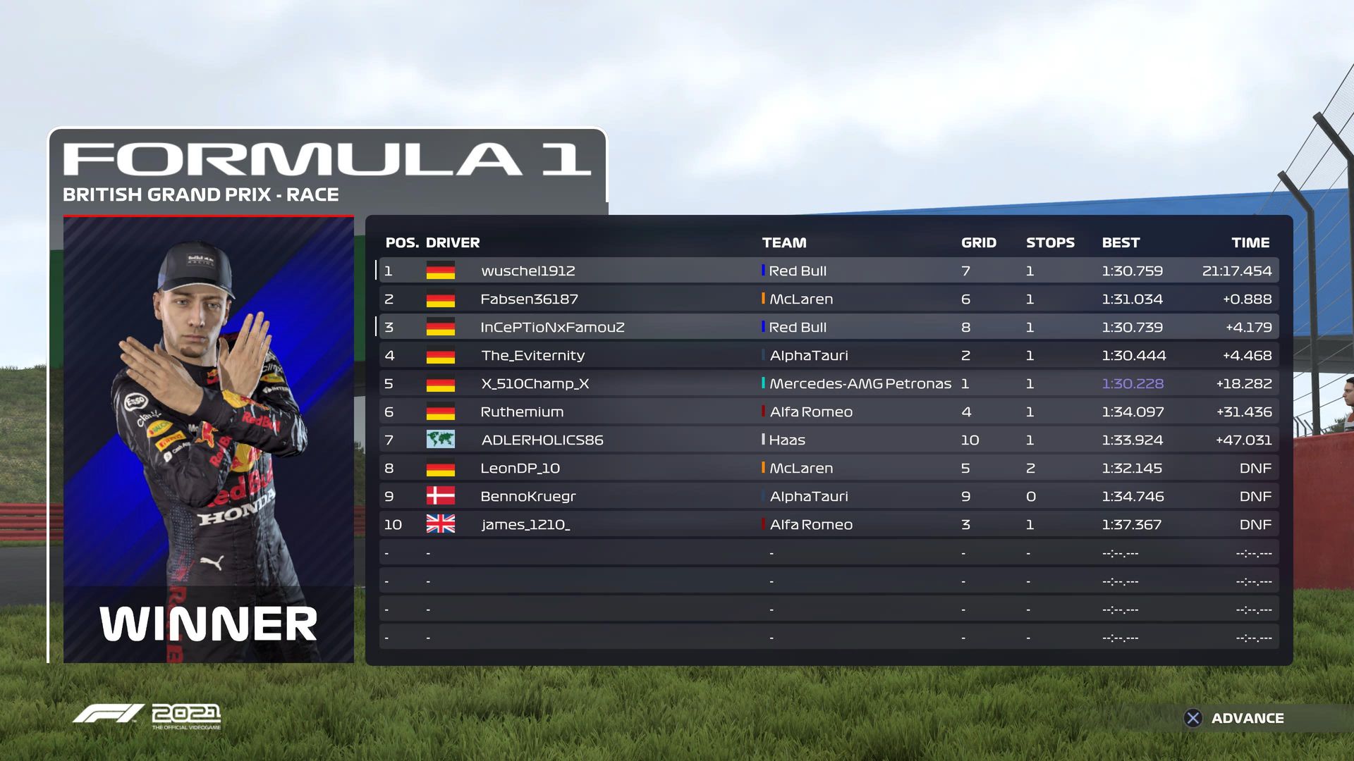 Sprint: War sehr vorsichtig am Anfang. Leider Zeit beim Boxenstopp verloren, da alle reingekommen sind und ich als zweiter Red Bull warten musste. Hing dann erst hinter Ruthemium fest, weil meine Reifen schnell anfingen zu überhitzen. Nach ein paar Runden war ich vorbei und hatte noch einen Zweikampf mit @DerMeyer99. War teilweise bisschen über der Grenze für meinen Geschmack. Ging dann auch irgendwann vorbei und musste am Ende nochmal pushen, da vorne einer noch eine Strafe hatte.