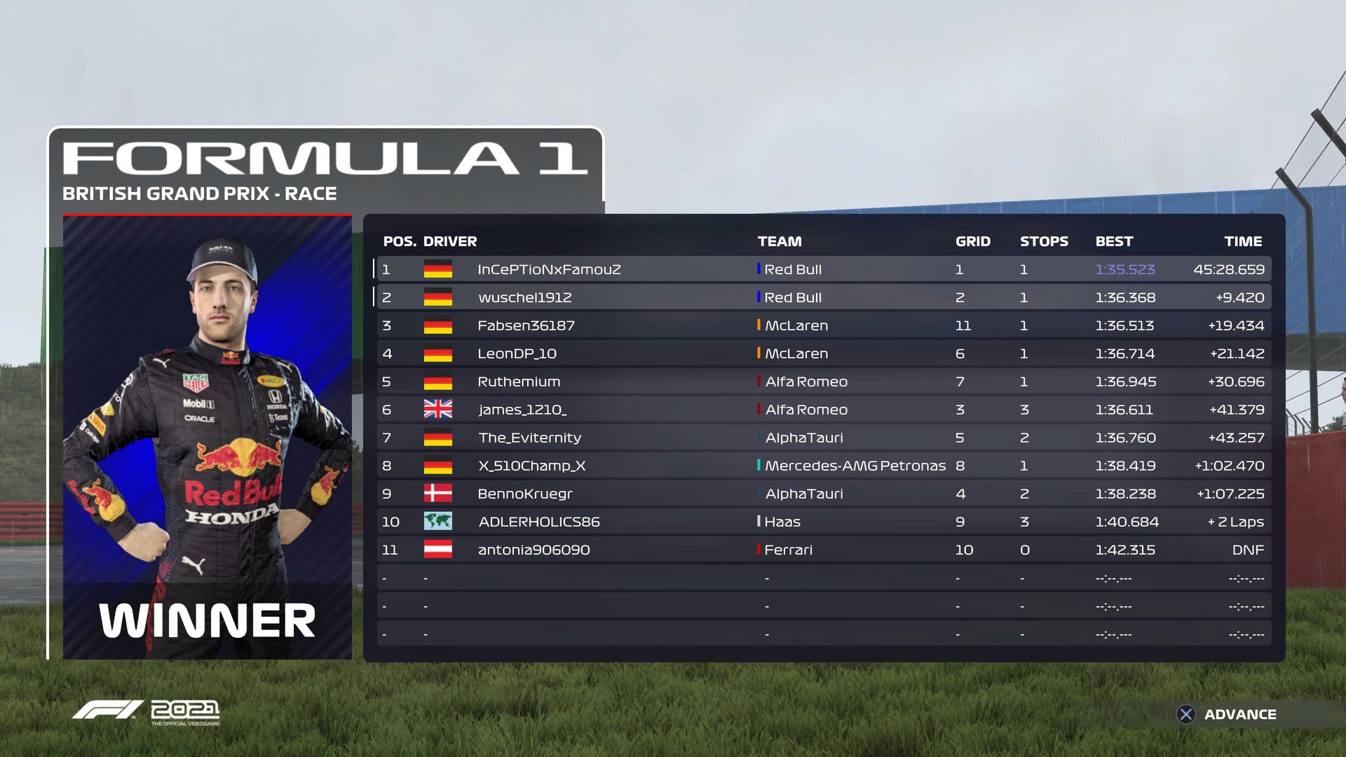 Sprint: War sehr vorsichtig am Anfang. Leider Zeit beim Boxenstopp verloren, da alle reingekommen sind und ich als zweiter Red Bull warten musste. Hing dann erst hinter Ruthemium fest, weil meine Reifen schnell anfingen zu überhitzen. Nach ein paar Runden war ich vorbei und hatte noch einen Zweikampf mit @DerMeyer99. War teilweise bisschen über der Grenze für meinen Geschmack. Ging dann auch irgendwann vorbei und musste am Ende nochmal pushen, da vorne einer noch eine Strafe hatte.