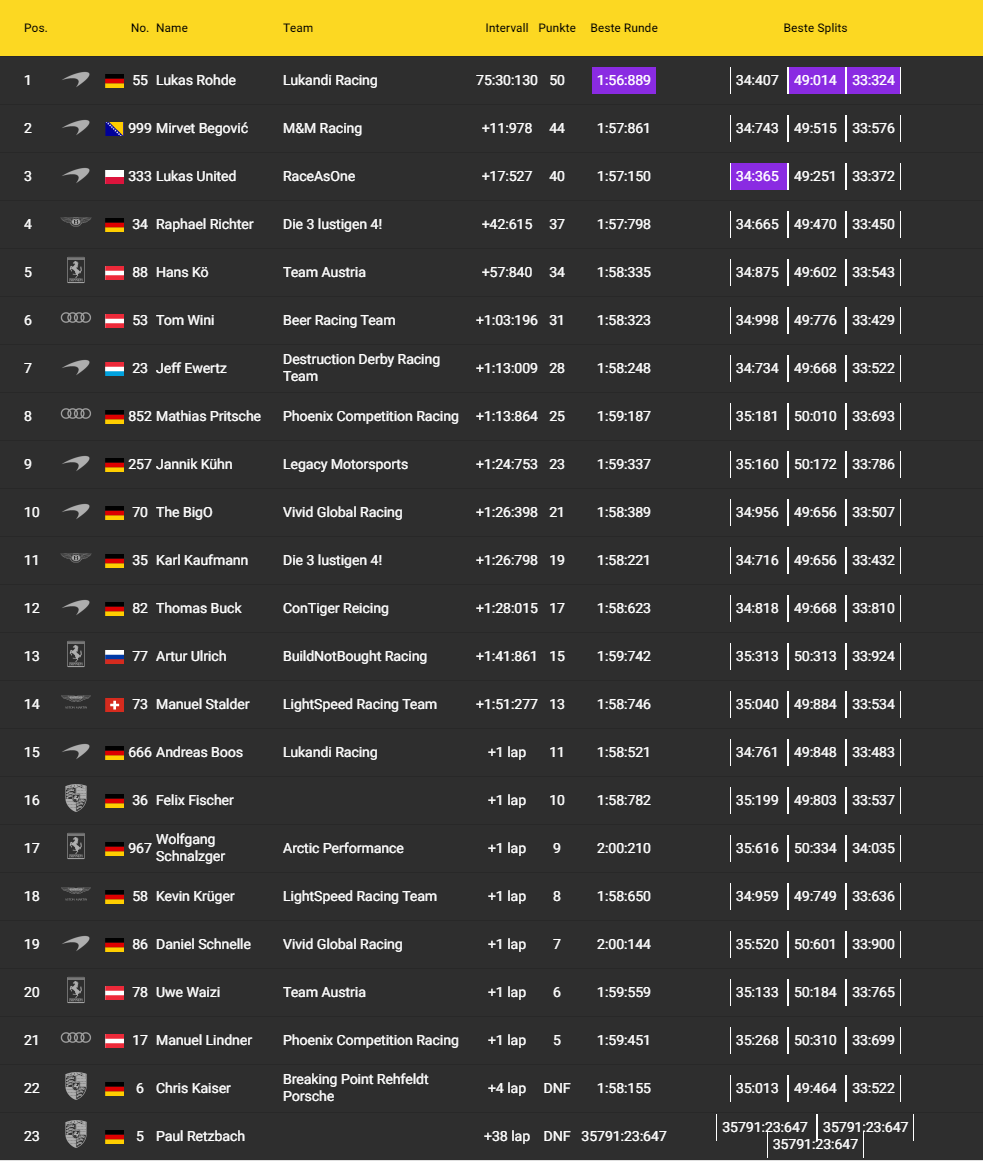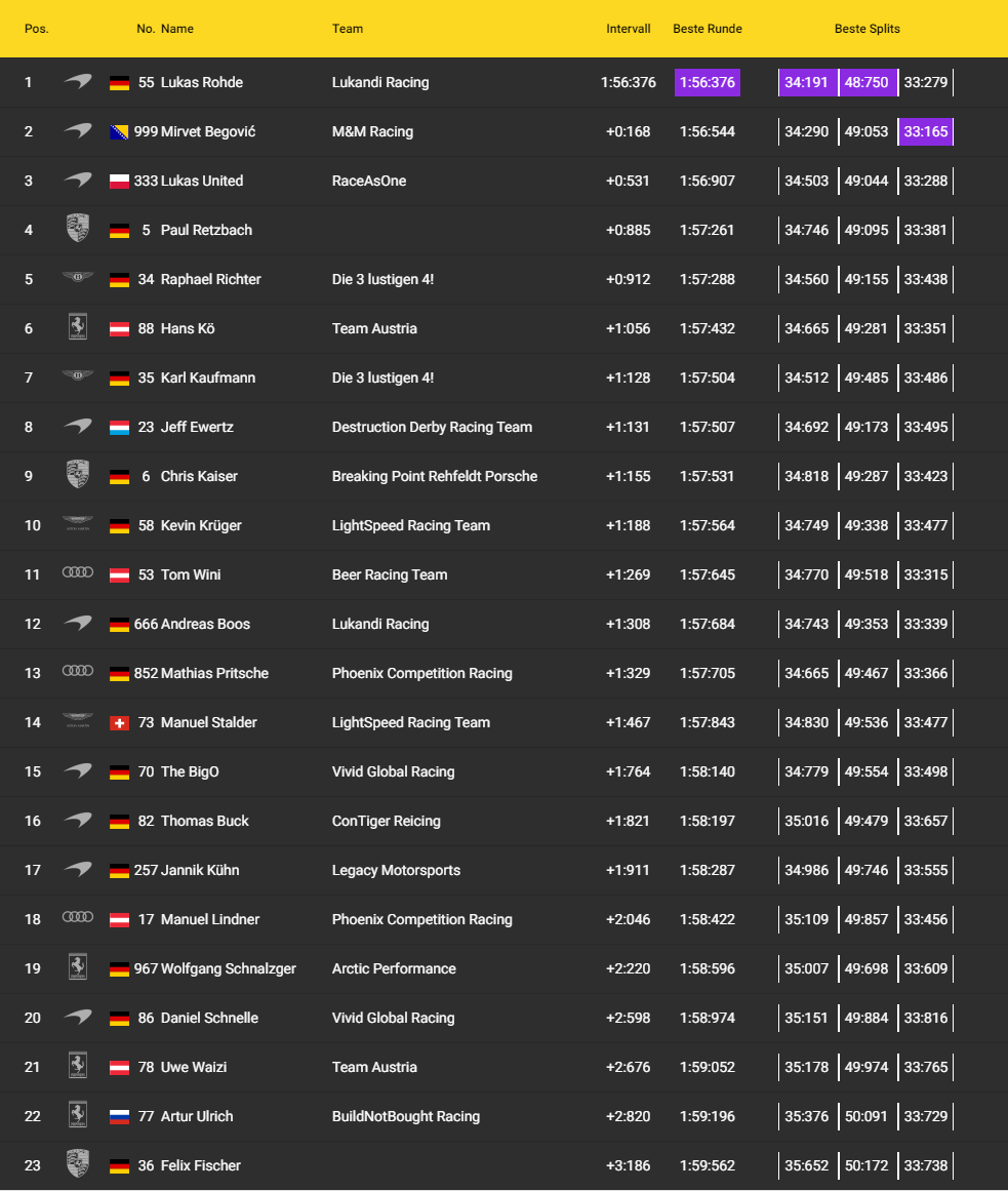 Die Ligaleitung steht für Fragen unserer Neuen im entsprechenden TS-Channel bereit.ca. 18:40 Uhr Qualifikation (20 Minuten Q. -zeit + 5 Minuten Pause nach dem Q.) ca. 19:05 Uhr Rennen (75 Minuten Rennzeit + 5 Minuten Einführungs- und Abschlussrunde) ca. 20:20 Uhr Sieger-Interviews Es wird empfohlen sich das Regelwerk und den Strafenkatalog gründlich durchzulesen!