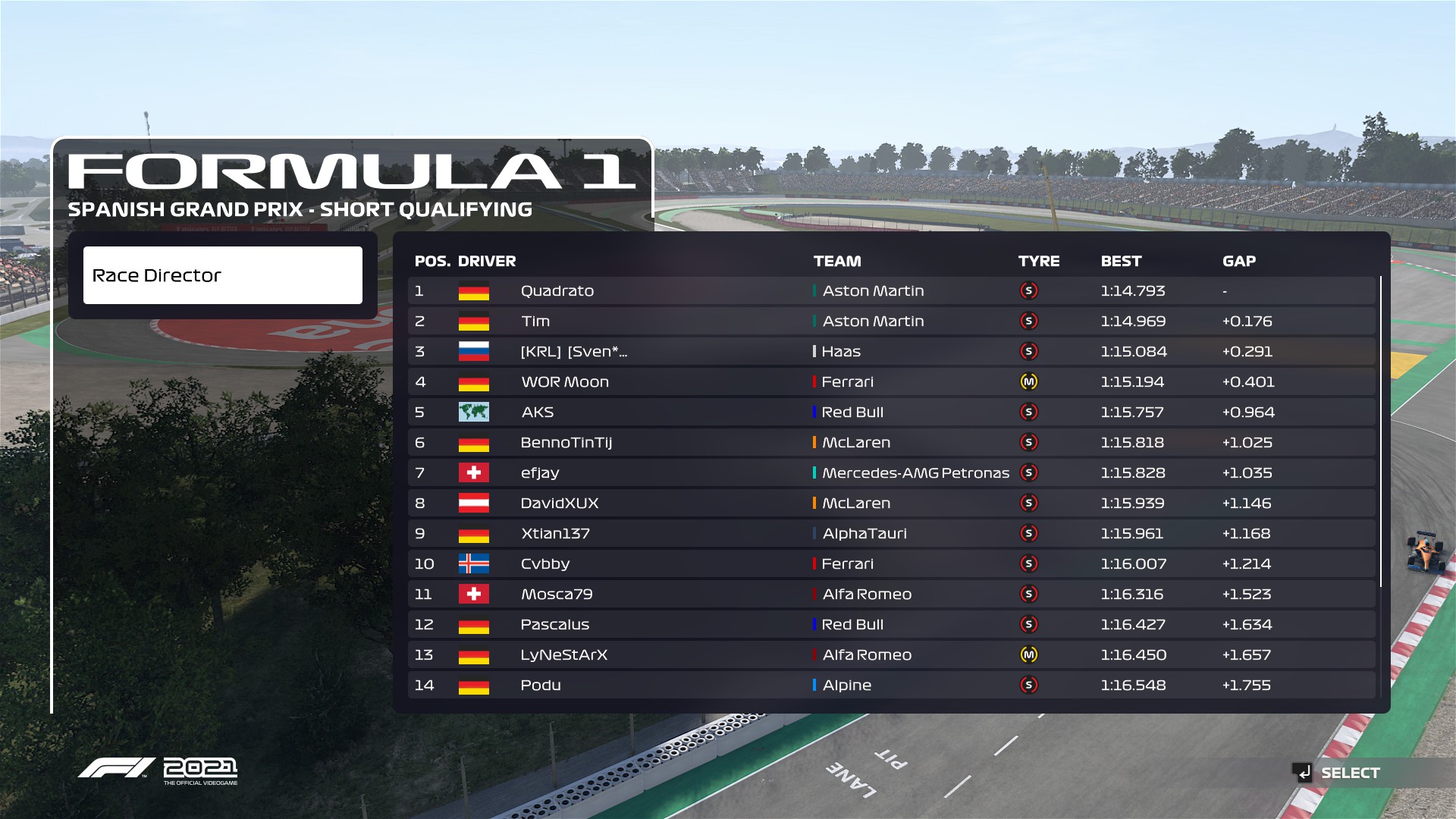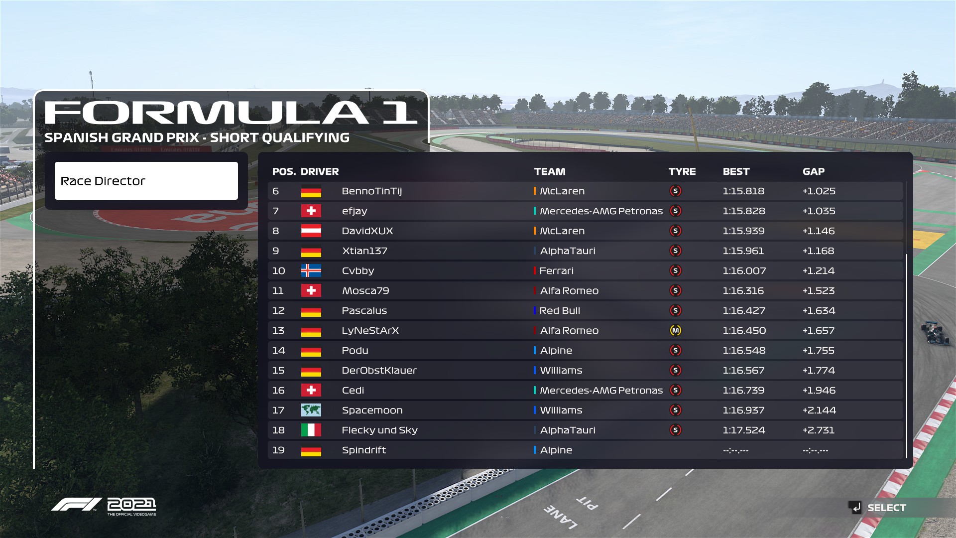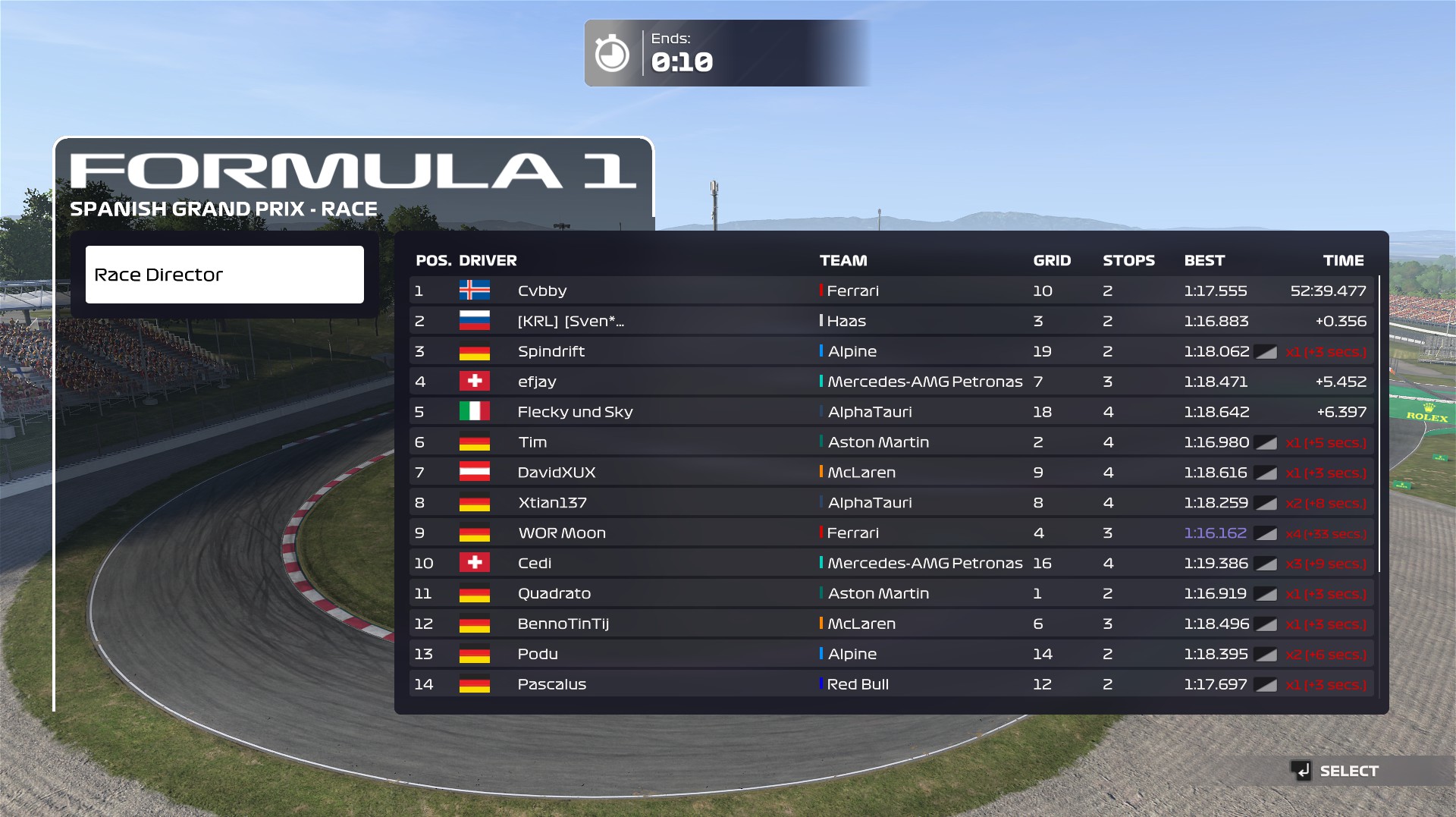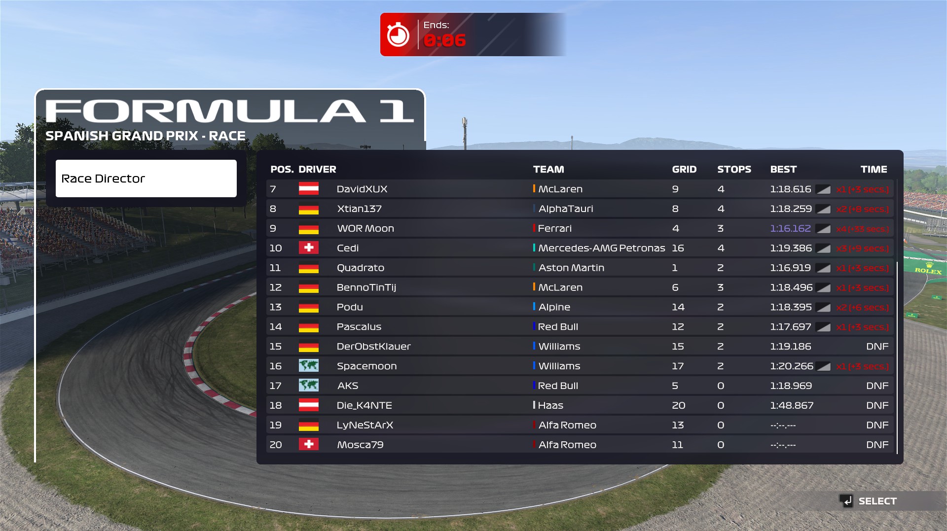 Rennen: War ein auf und ab. Am Anfang vom Rennen hatte ich keinen Sound und musste das Spiel neustarten während dem Safetycar. Danach hatte ich viele spannende Fights und leider ein bisschen zu viele Strafen.