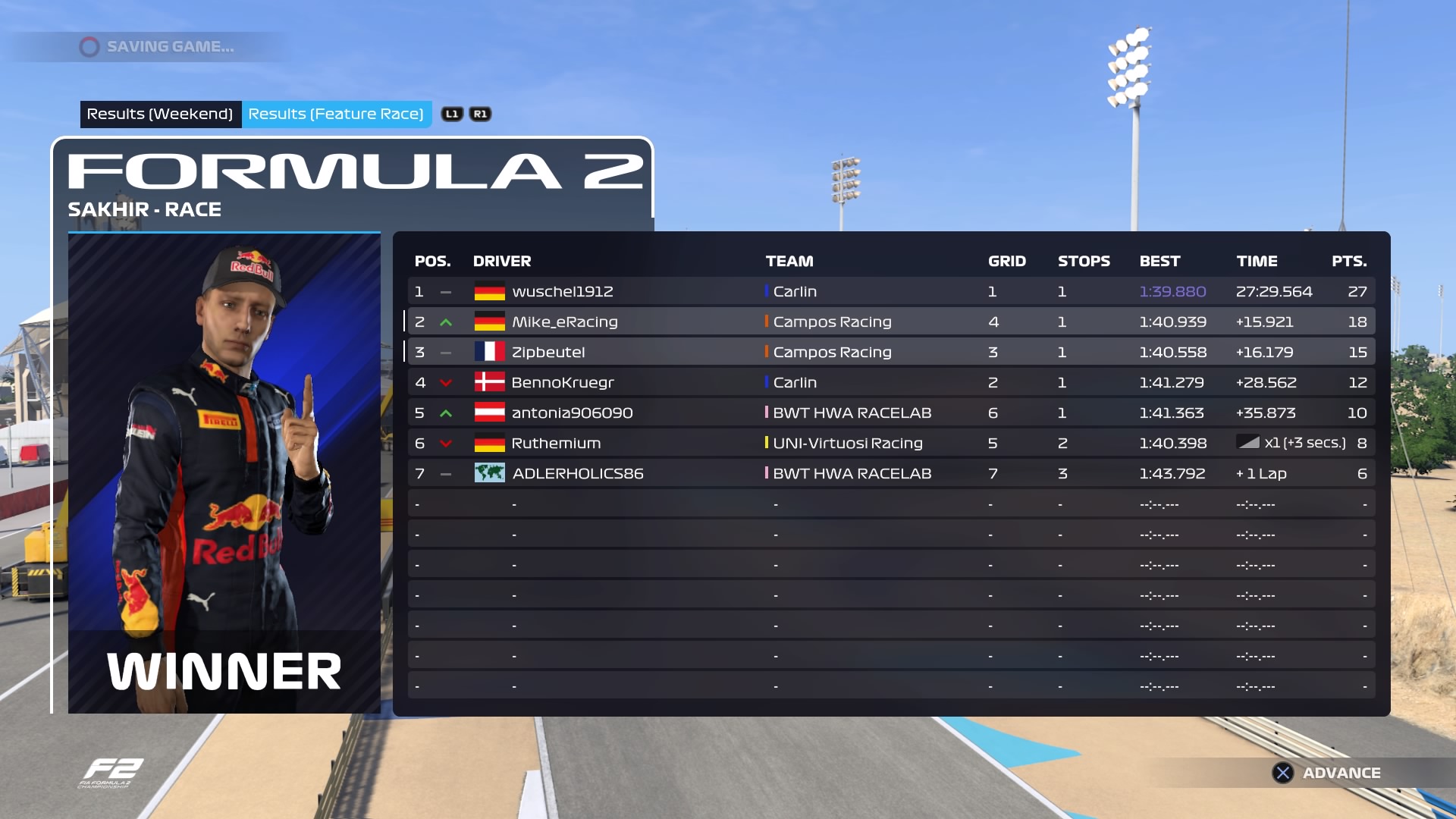 Hauptrennen: In den ersten Runden konnte ich mich auf P2 vorarbeiten und konnte dann nach hinten einen ordentlichen Abstand rausfahren, da die 3er-Gruppe hinter mir hart am fighten war. Gegen Ende konnte sich dann Zipbeutel lösen und Jagd auf mich machen. In den letzten Runden war er dann dicht hinter mir, konnte mich aber gerade noch so verteidigen. Eine Runde länger und ich wäre fällig gewesen.