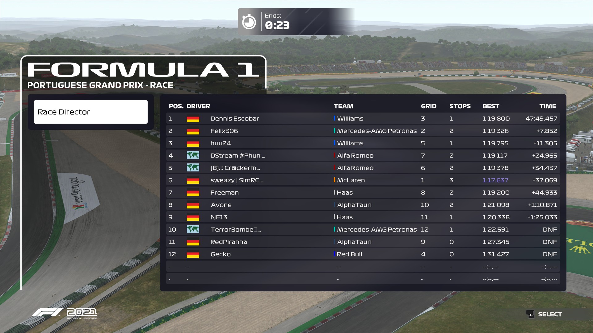 Rennen: Einigermaßen gut weggekommen und auf P3 vorgezogen. Kurz vor T1 war ich dann sogar zum Teil innen neben Felix306, der auf P2 war. In der Kurve kam es dann zur Berührung, wodurch ich mich drehte. Mein Frontflügel war zum Glück noch intakt und ich versuchte wieder aufzuholen. Direkt in der zweiten Runde stand dann plötzlich am Kurvenausgang von T1 ein Auto genau auf der Rennlinie. Ich hatte keine gelbe Flagge gesehen und falls es eine gab, kam sie deutlich zu spät (sonst kommt in dem Spiel ja sofort eine gelbe Flagge, nur weil mal jemand langsamer fährt, z.B. im Qualifying)...