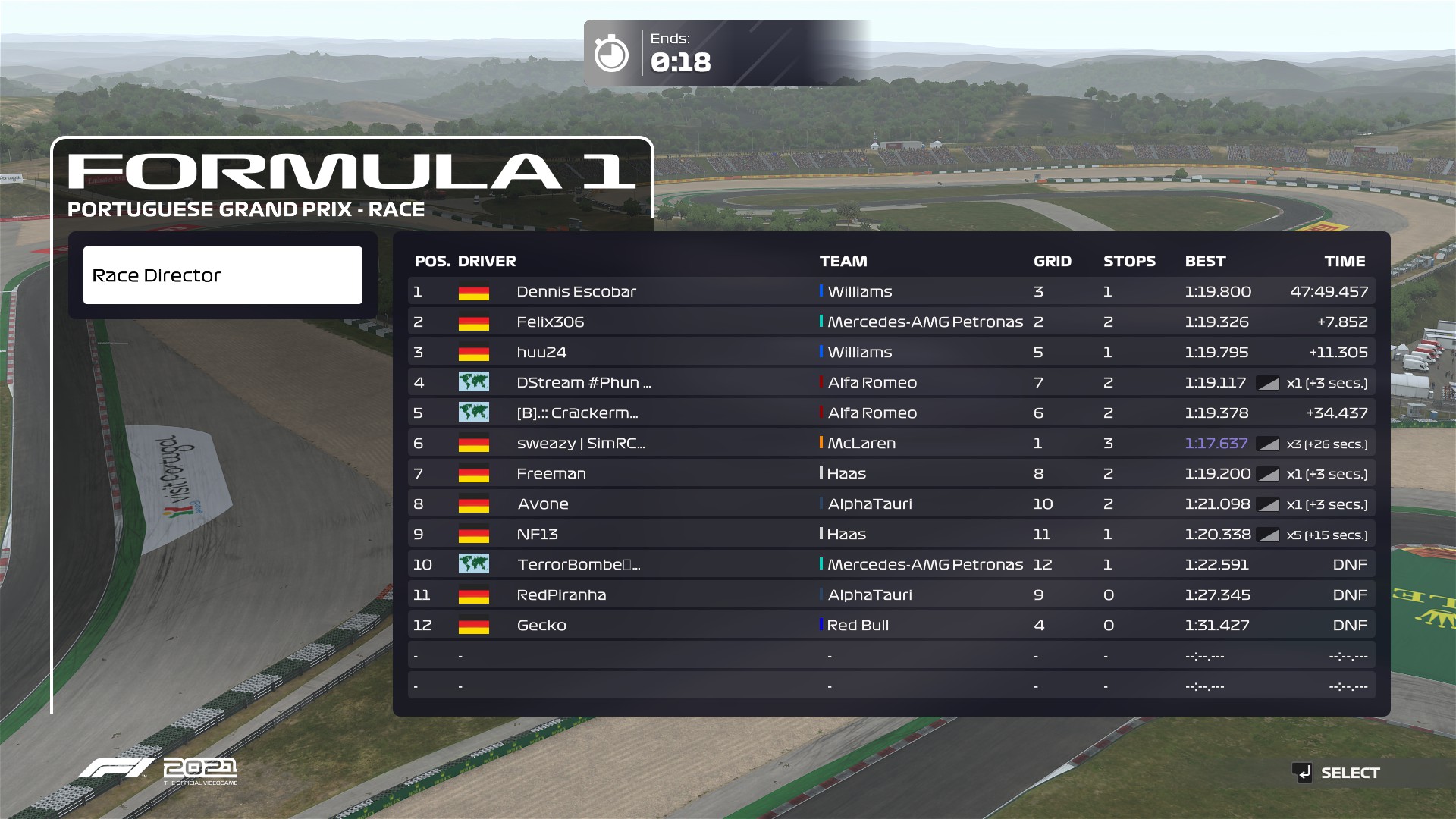 Nach dem Start auf P4 gerutscht. War soweit okay. Nach dem ersten Safty-Car ist P1 losgefahren aber P2 war immer noch langsam. Wollte mich dann vorbei schieben aber dabei kam es zu einer Kollision. Ob es jetzt meine schuld war kann ich nicht mehr genau sagen. Gab kein Video davon. Falls es meine Schuld war dann entschuldige ich mich dafür. War wohl nicht ganz mein Tag. Ansonsten Glückwunsch für die die heute ins Ziel gekommen sind.