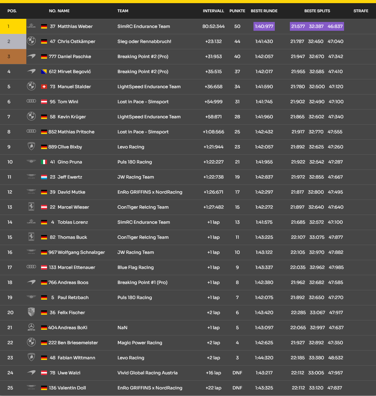 Die Ligaleitung steht für Fragen unserer Neuen im entsprechenden TS-Channel bereit.ca. 17:55 Uhr Verpflichtendes Fahrerbriefing im TS. Verlassen der Boxengasse istwährend des Briefings untersagt! ca. 18:00 Uhr Qualifikation (20 Minuten Q. -zeit + 3 Minuten Pause nach dem Q.) ca. 18:25 Uhr Rennen (80 Minuten Rennzeit + 3 Minuten Einführungs- und Abschlussrunde) ca. 19:50 Uhr Sieger-Interviews Es wird empfohlen sich das Regelwerk und den Strafenkatalog gründlich durchzulesen!