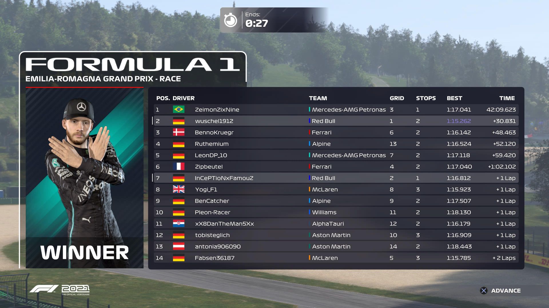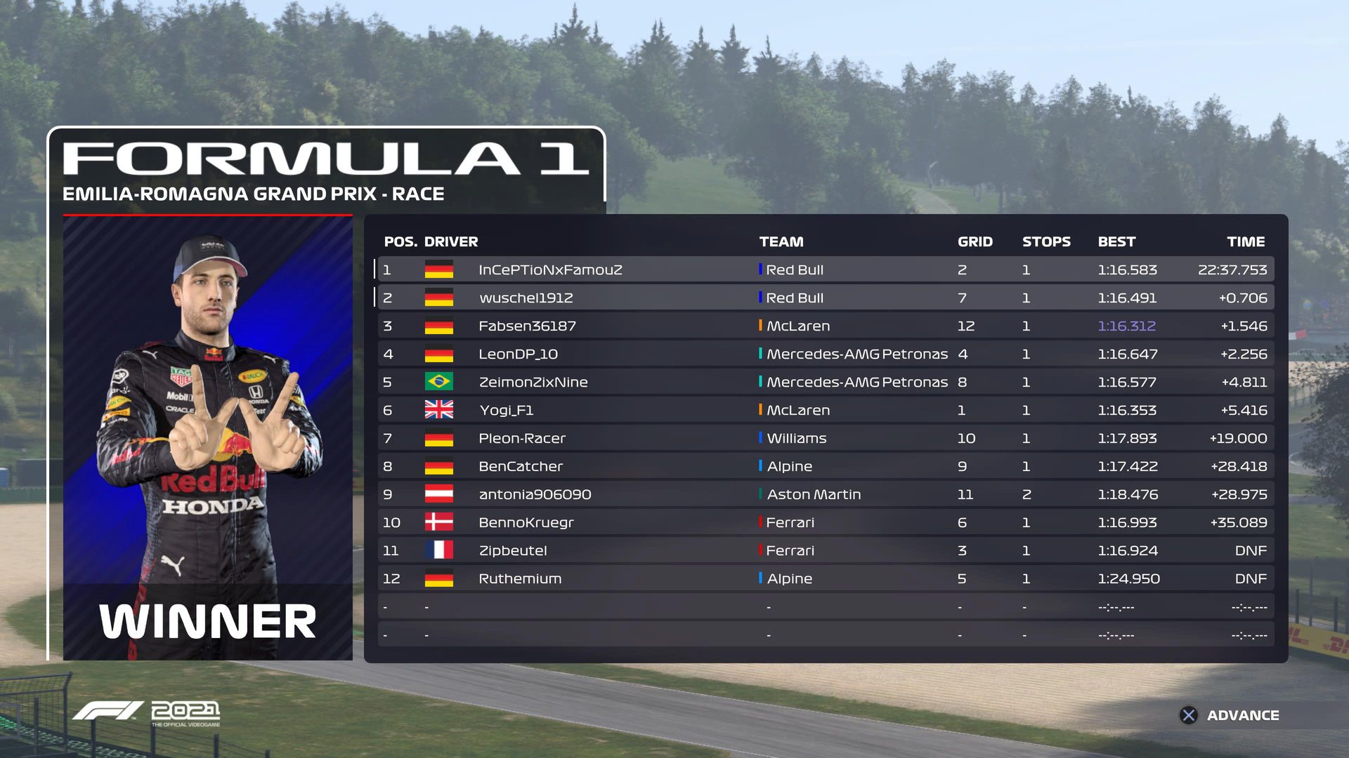 Rennen: Kurzer Text zum Rennen ( Vorfälle, besondere Überholmanöver, Gedanken zu Boxenstopps, Undercuts usw.)