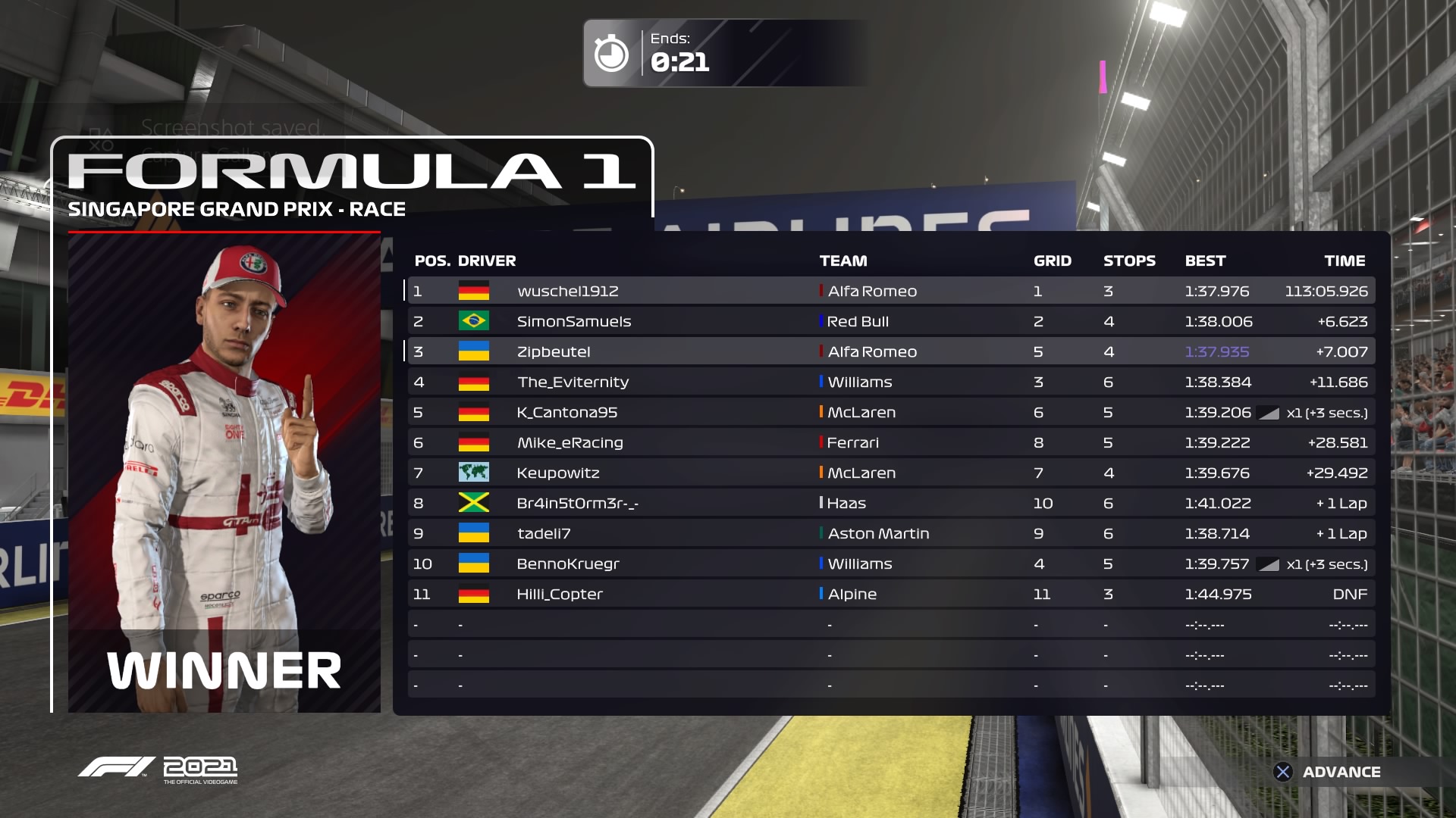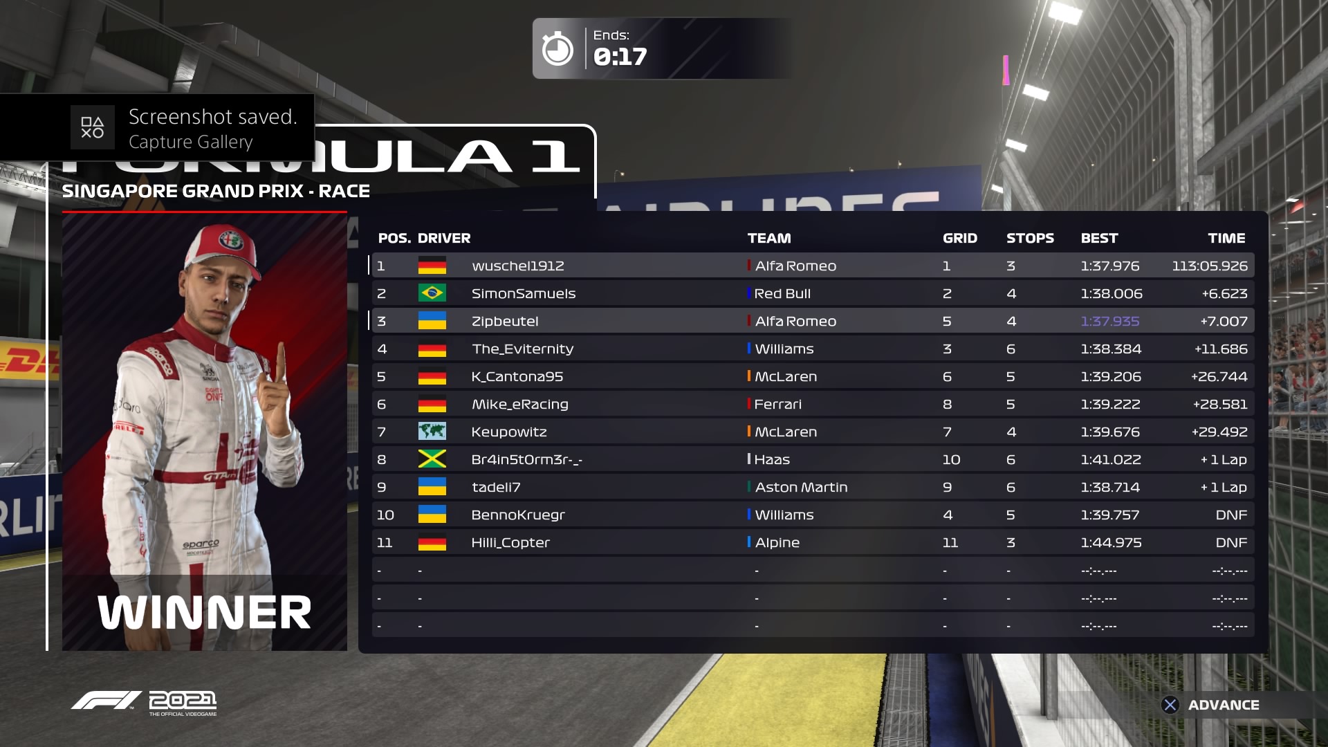 Rennen: Schlechter Start, Prinz Zipbeutel konnte direkt vorbeigehen. Hab mich dann die nächsten Runden an sein Heck gehängt, kam aber net vorbei. In Runde 4 passierte mir dann der 1 Fehler für den ich dann gleich doppelt bestraft wurde, denn ich holte mir nicht nur Flügelschaden sondern auch noch ne Verwarnung mit obendrauf, danach dann erstml Box und auf die Mediums. Nen paar Runden später setzte der Regen ein und ich konnte wieder aufholen. In Runde 21 gings dann vorbei an Keupowitz und ich schöpfte Hoffnung das der Abend doch noch gut werden könnte. Zwei Runden später war der Prinz allerdings wieder vorbei, und ich merkte das ich im Regen nicht zurecht komme und es doch mal gefälligst trocken werden sollte. In Runde 25 wars wieder einigermaßen trocken, und ich ging sofort in die Box um mir Mediums zu holen. Allerdings war ich extrem inkompetent und stellte nicht um auf Mediums sondern wechselte noch mal auf Inter (I am stupid). In der Runde auf Inter fuhr ich mir dann in lauter Rage noch den Flügel ab so das der Stopp auf Mediums dann noch länger dauerte. Auf den Mediums mit weniger Benzin fühlte sich das Auto dann angenehmer zum fahren an und ich wurde wieder schneller, allerdings fuhr ich auch sehr risikobereit was in Singapur nicht unbedingt das beste ist. In Runde 32 gings vorbei an Br4in5t0rm3r, und die Jagd nach den McLaren ging weiter. Leider war ich sehr fehleranfällig und haute mir in Runde 35 wieder den Flügel kaputt und konnte den wechseln. Von nun an fuhr ich wirklich nur noch alles oder nichts, das konnte nicht gut enden. In Runde 45 war ich einmal zu früh mitm einlenken dran, und zerstörte den Williams mal wieder komplett. Hab dann noch Teammate Gerald/ Eviternity angefeuert das er Mike_eRacing überholen konnte, was zum Glück auch noch klappte. Am Ende wurde ich dann noch Zeuge und Kameramann für TikTok zugleich vom Duell Simon vs Marcel2502 was bekanntlich Marcel für sich entscheiden konnte