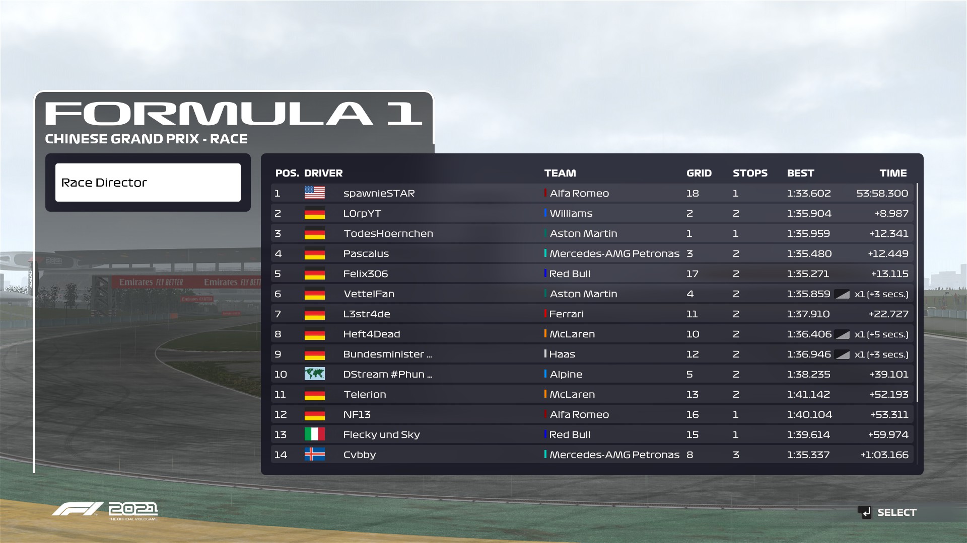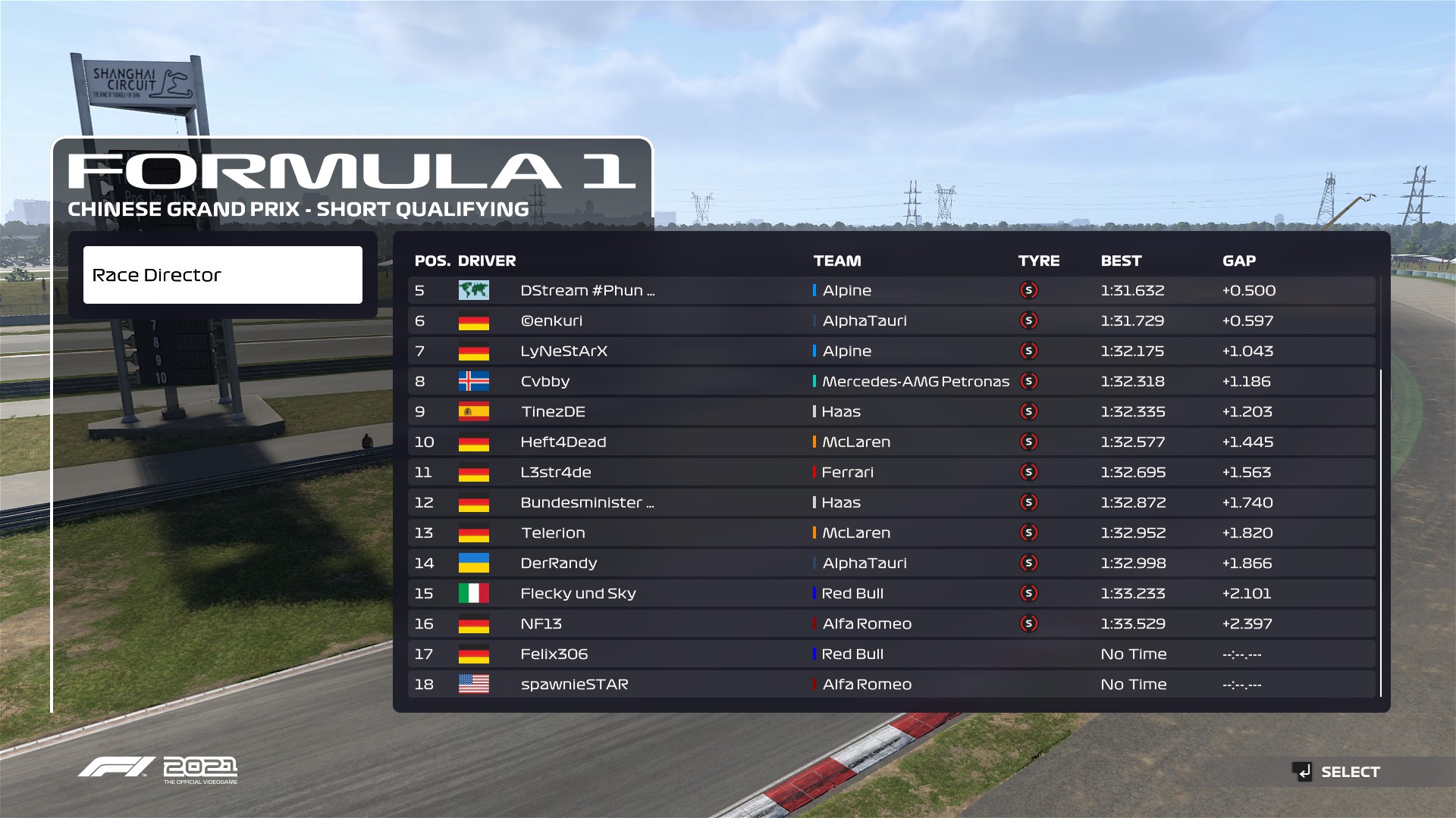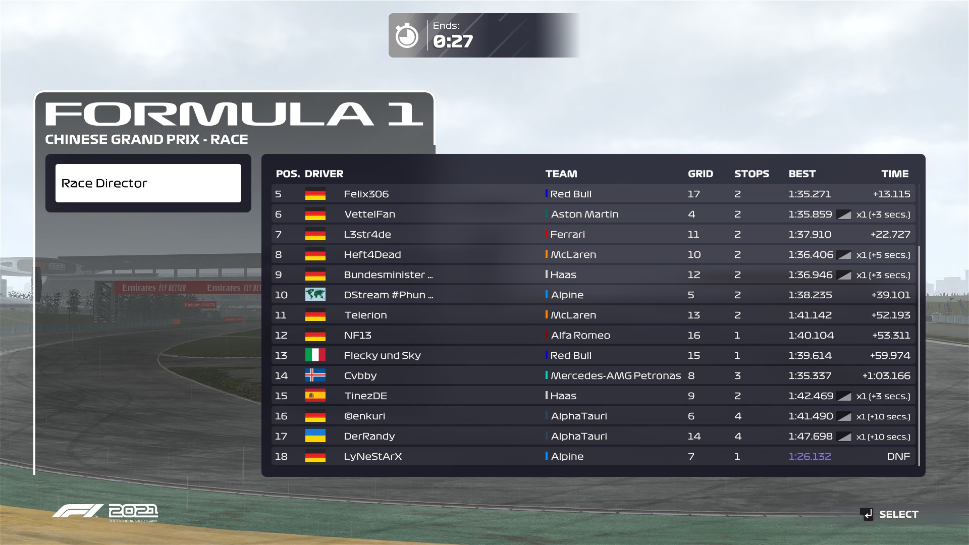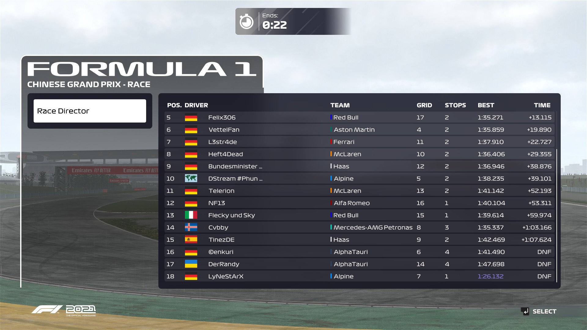 Rennen: Ich hatte einen Fehlstart und musste dadurch direkt in die Box. Nachdem ich die DT abgesessen habe, bin ich durch das SC wieder nach vorne gekommen. Am Ende war ich im DRS-Train mit TodesHoernchen und Pascalus . P5 war danach das Beste, was ich rausholen konnte.