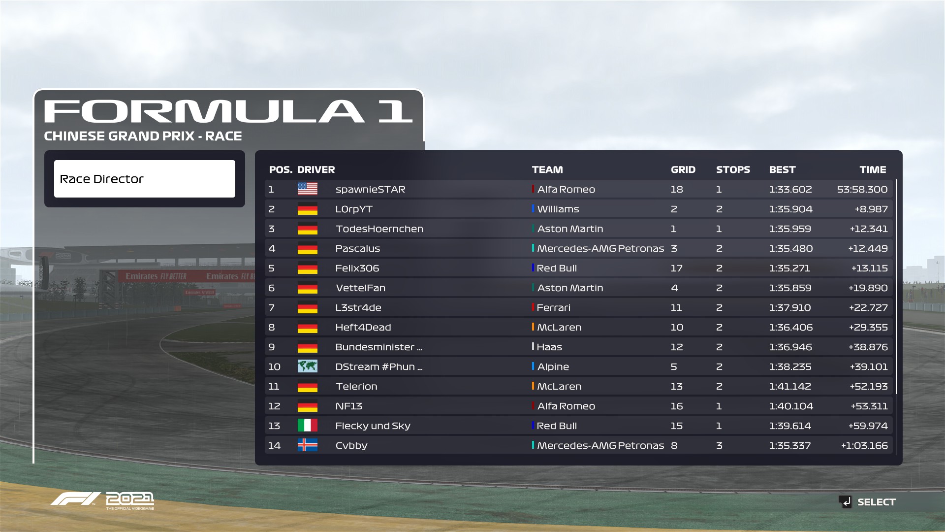 Rennen: Erster Absturz des Spiels direkt beim ersten Frame in der Aufwärmrunde, dann konnte ich beim Start nicht mehr das Steuer übernehmen. Dann Spiel neugestartet, ging aber immer noch nicht. Spiel noch ein 2. Mal neu gestartet, dann gings. Hab mich dann bis zum Ende des Regens ein bisschen nach vorne gekämpft, dann ist mein Spiel nochmal abgestürzt und meine KI hat mich DNF gefahren.