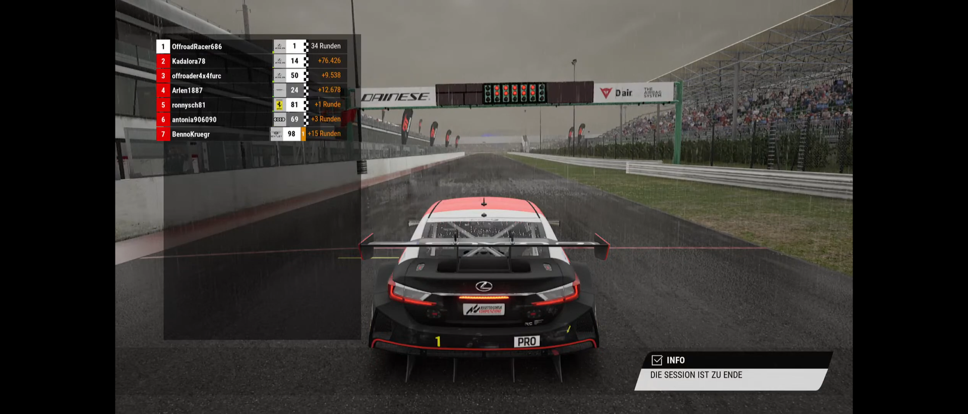 1.Rennen: Start halbwegs gut erwischt. Bin in Kurve 1 außen und auf einmal schießt Dercornercuter von rechts vor meinen Lexus.