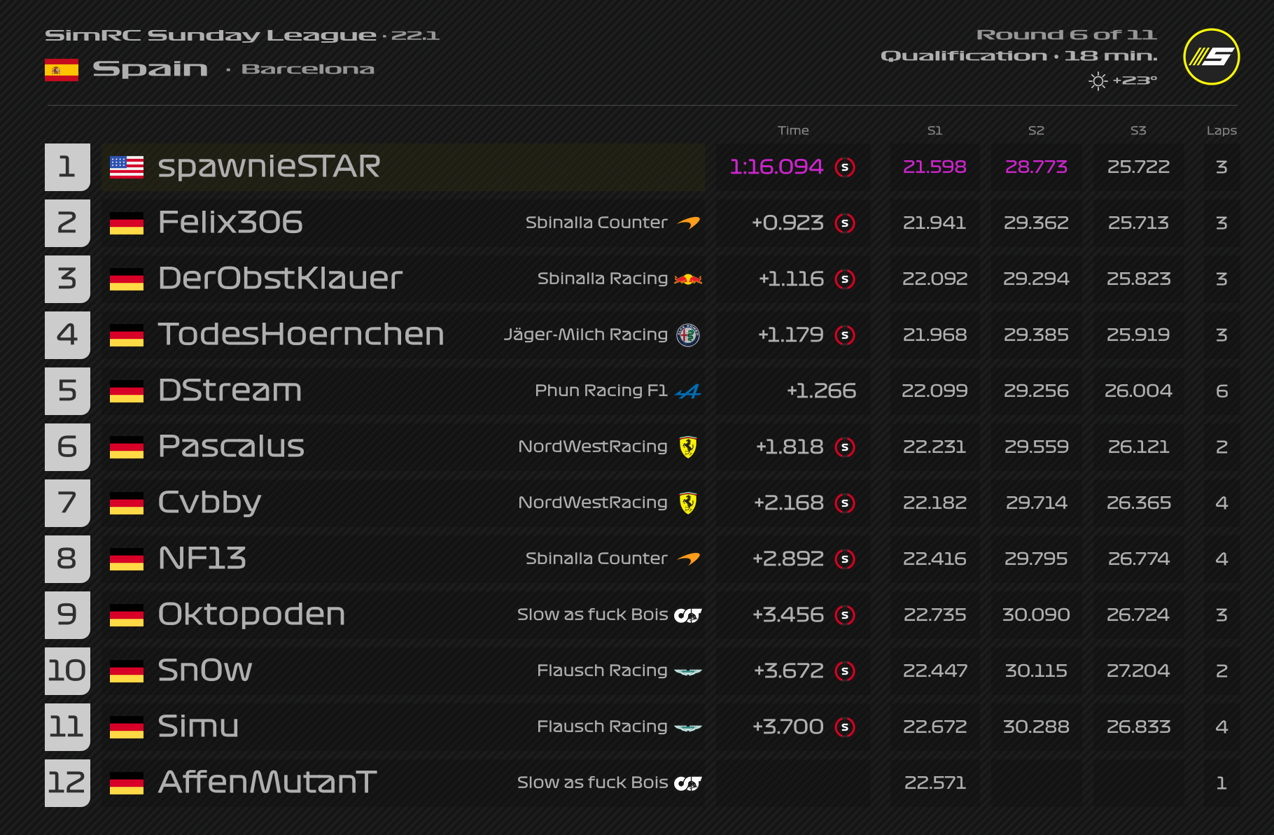 Fazit: 6 Punkte nehm ich gerne mit. Pace im Rennen war allgemein Langsam weil ich kein Vertrauen ins Auto hatte. Ab Lap 50 1-2 Sekunden schneller gefahren als die Runden davor, weil Vertrauen wieder da war. 0 Grip trotzdem und Spanien ist ne dumme Strecke.