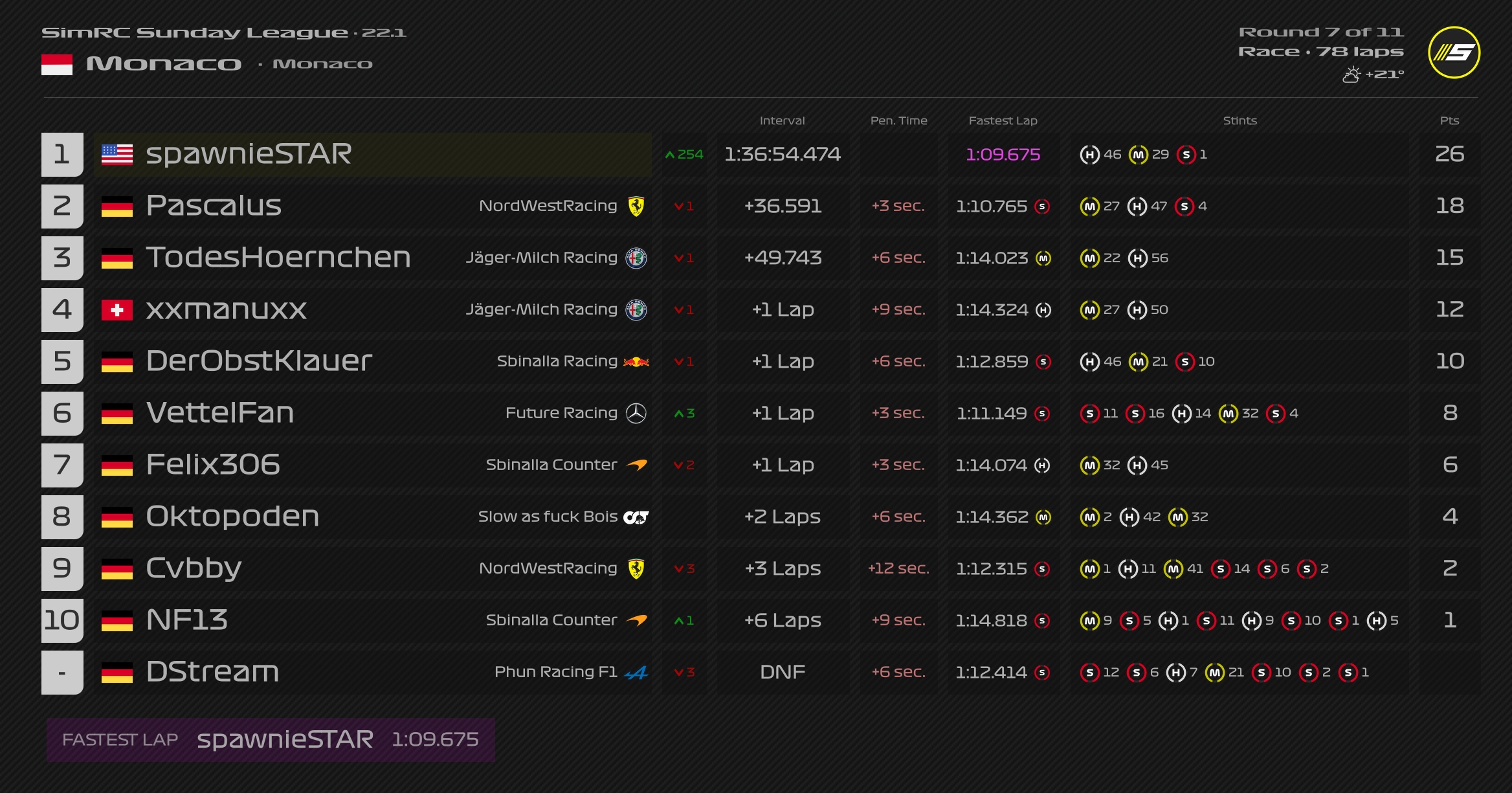 Rennen: Kurzer Text zum Rennen (Vorfälle, besondere Überholmanöver, Gedanken zu Boxenstopps, Strategien usw.)