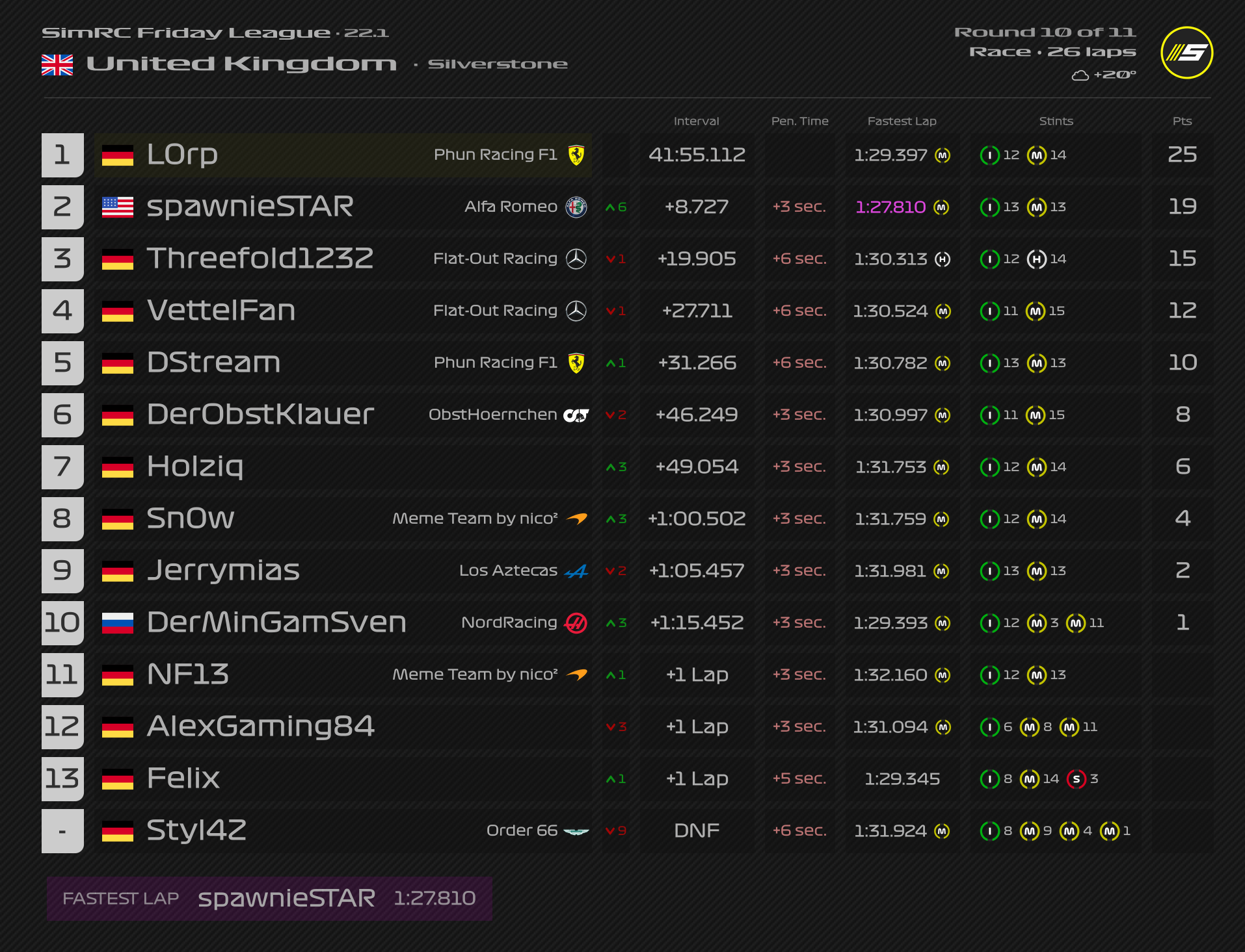 Rennen: Kurzer Text zum Rennen (Vorfälle, besondere Überholmanöver, Gedanken zu Boxenstopps, Strategien usw.)