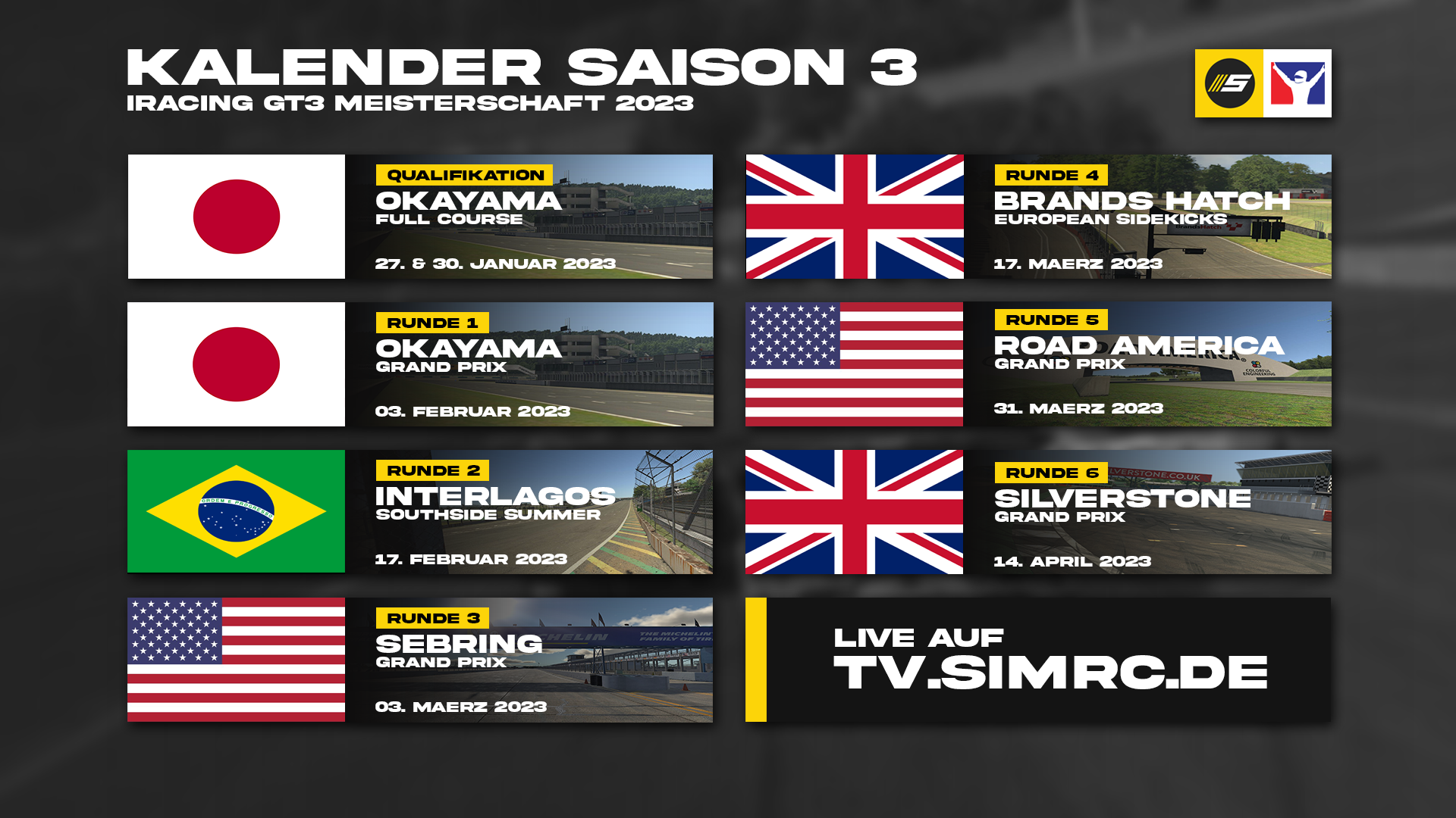 | Brands Hatch | 17.03.2023 | 18:30 Uhr | 11:00 Uhr | 13:00 Uhr | 15:00 Uhr |