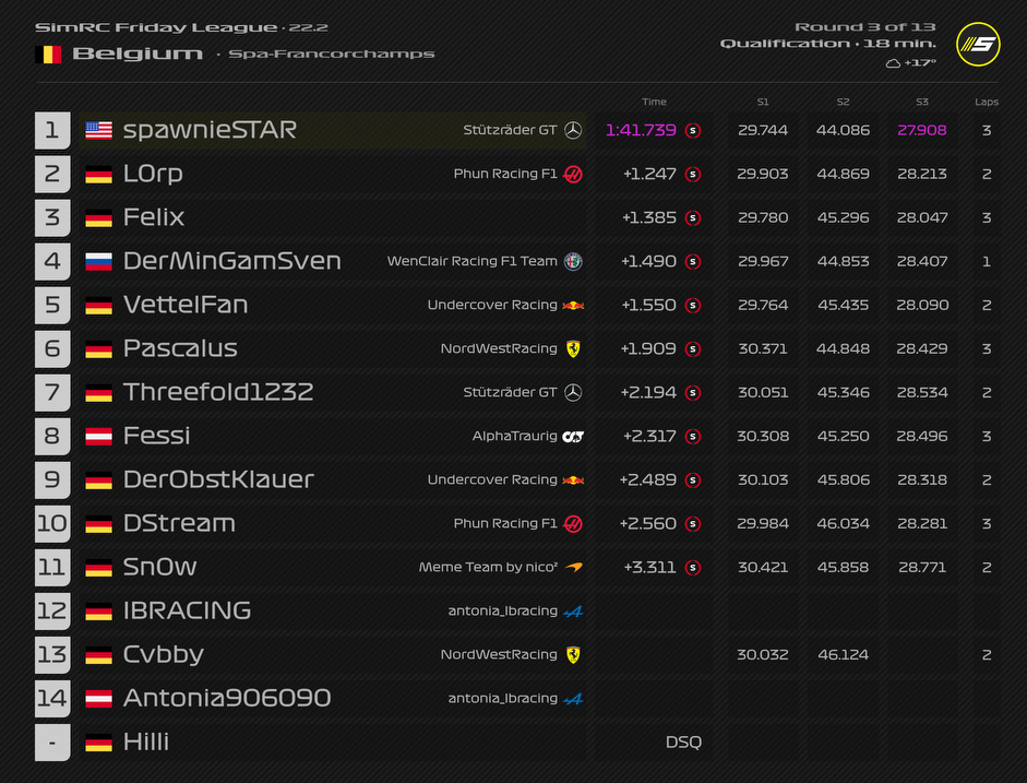 Rennen: im Rennen ein guten Start gehabt auf P3 aber dann wurde ich mitten im SC von DerMinGamSven gedreht und bin dadurch zurückgefallen konnte aber beim SC Restart plätze gut machen und beim nächsten SC ist mir DStream mit voll Speed ins Heck gefahren wodurch ich Schaden erlitten habe am Unterboden und Sidepod aber immerhin punkte geholt hätte aber laufen können
