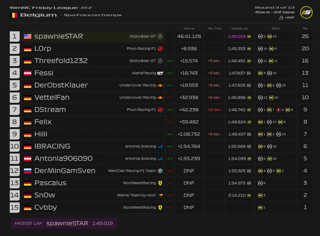 Rennen: Pace nicht super stark, hatte noch gehofft das später noch mal ein viertes SC kommt um vielleicht irgendwie noch zu gewinnen, aber kam leider nicht. Am Ende nur 3 Zehntel hinter der schnellsten Runde, hätte also eventuell noch später in die Box kommen sollen, da ich sowieso recht viel Platz zu Threefold1232 hatte.
