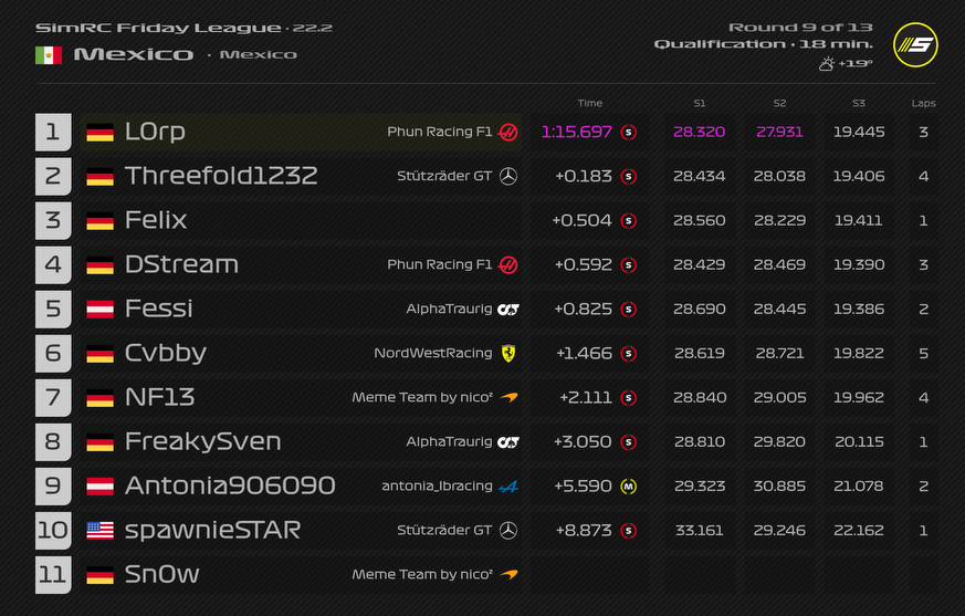 Rennen: Gant solide, Start war ok und dann nur noch am Ende gegen Spawnie bisschen verteidigt. Habe dann gewonnen, weil ich nur zwei Verwarnungen hatte.