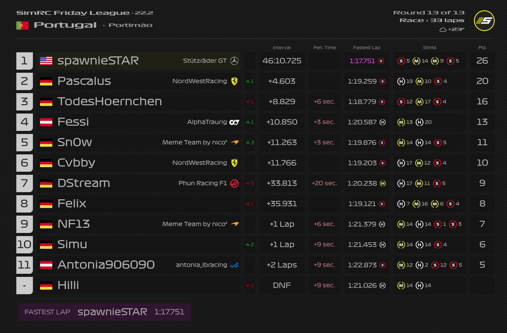 Rennen: Kurzer Text zum Rennen (Vorfälle, besondere Überholmanöver, Gedanken zu Boxenstopps, Strategien usw.)