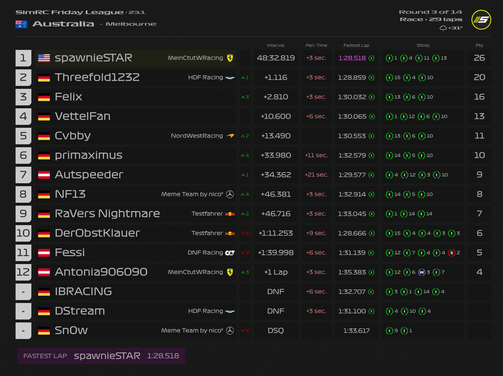 Rennen: Kurzer Text zum Rennen (Vorfälle, besondere Überholmanöver, Gedanken zu Boxenstopps, Strategien usw.)