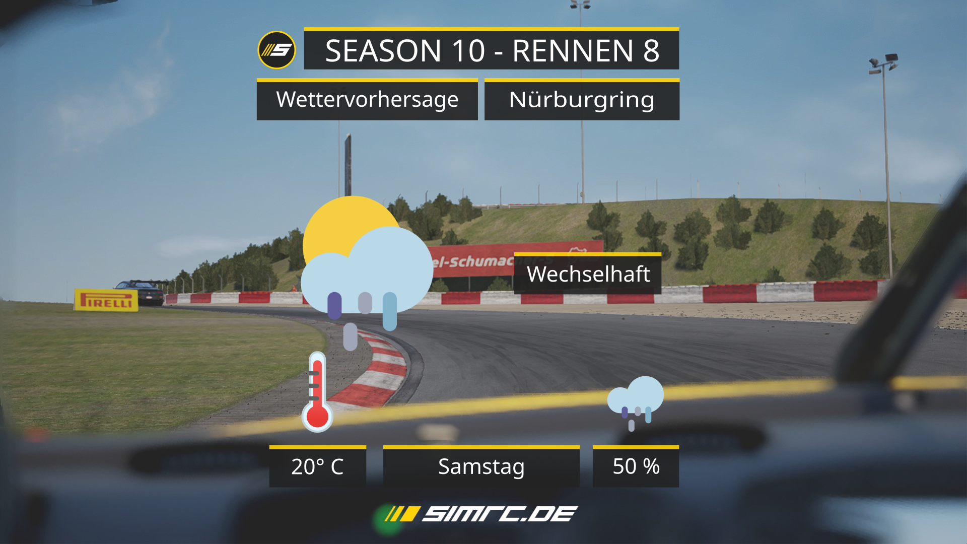 Der normale Trainingsserver wird wie immer Servereinstellung für das Rennen haben. Da die Ergebnisse des Tools immer ein wenig Abweichen, tendieren wir eher im Zweifel das Wetter etwas dynamischer zu gestalten und uns nicht 100%ig an den Werten festzuhalten. IdR ist die angezeigte Regenwahrscheinlichkeit im Tool ein paar Prozentpunkte höher als in unserer Vorhersage fürs Forum.