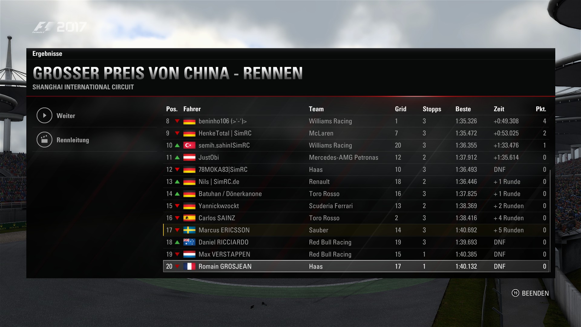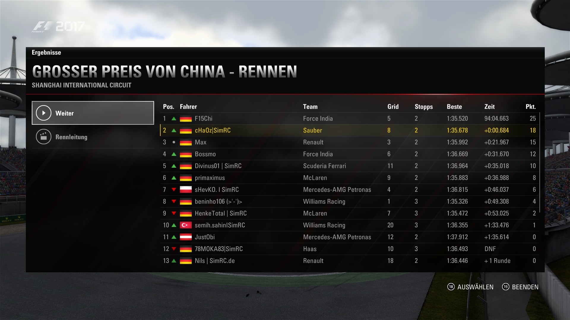Rennergebnis: Endplatzierung im Rennen (z.B. 5)