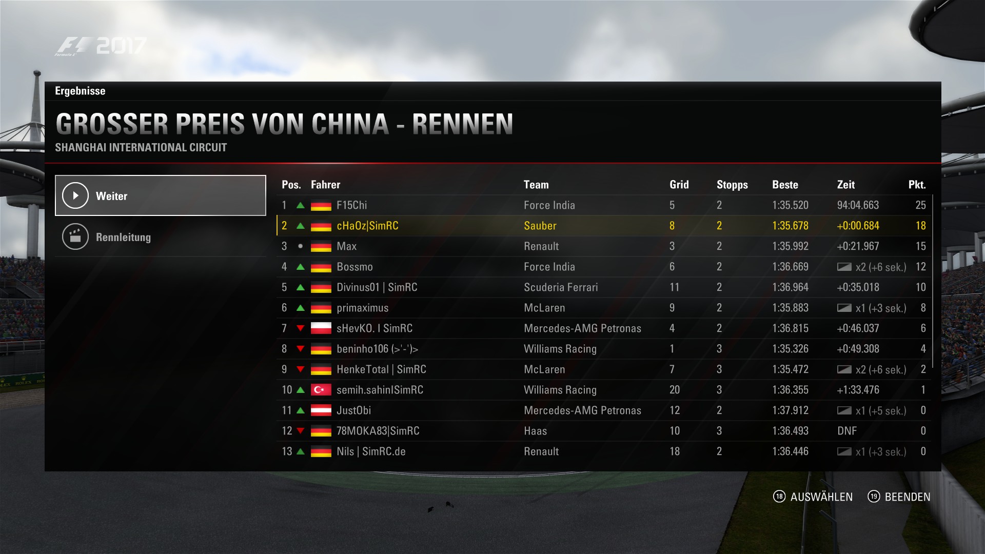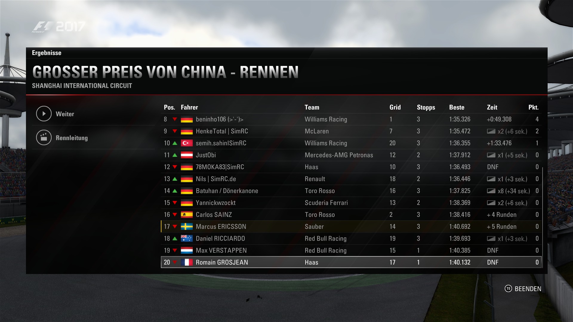 Rennen: Kurzer Text zum Rennen (Vorfälle, besondere Überholmanöver, Gedanken zu Boxenstopps, Undercuts usw.)