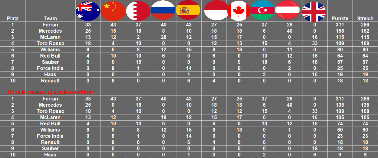 • Toro Rosso müsste doch 122 Punkte haben ohne ersatzfahrer? 78+44 = 122 Wenn ich nicht völlig aufm Schlauch stehe ^^