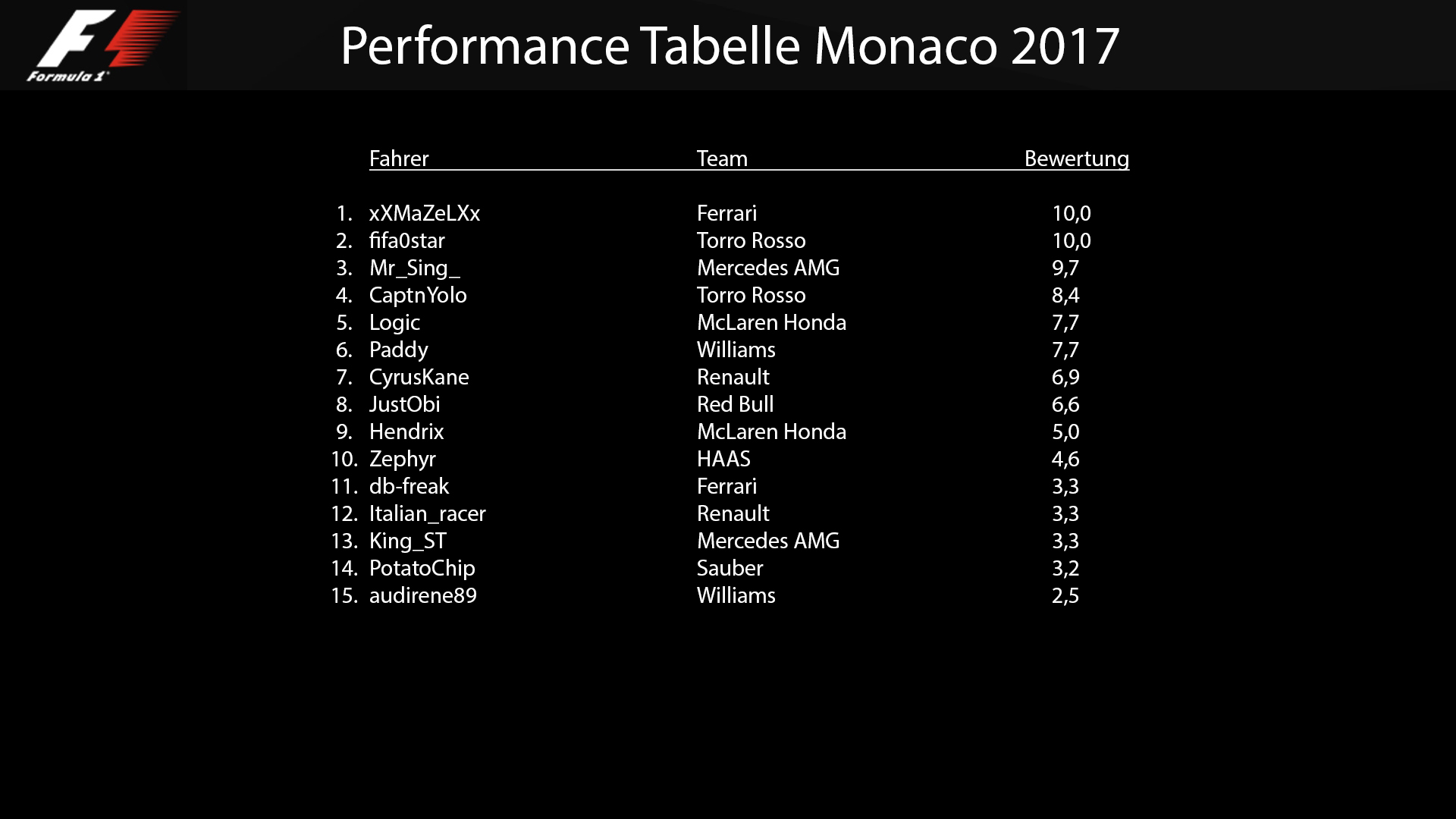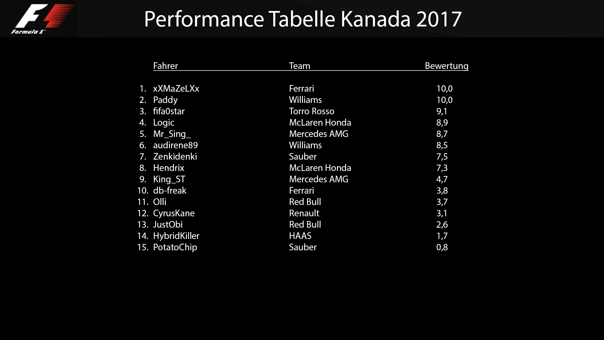Die Bewertung wäre 0 Letzter - 10 Erster, miteingerechnet sind die gefahrenen Runden im zusammenspiel der Ausfälle (wenn jemand viele Runden hat, bei vielen ausfällen wird das besser gewertet). Genaues Rechenbeispiel könnt ich euch geben wenn ich zuhause bin, aber so die Theorie.