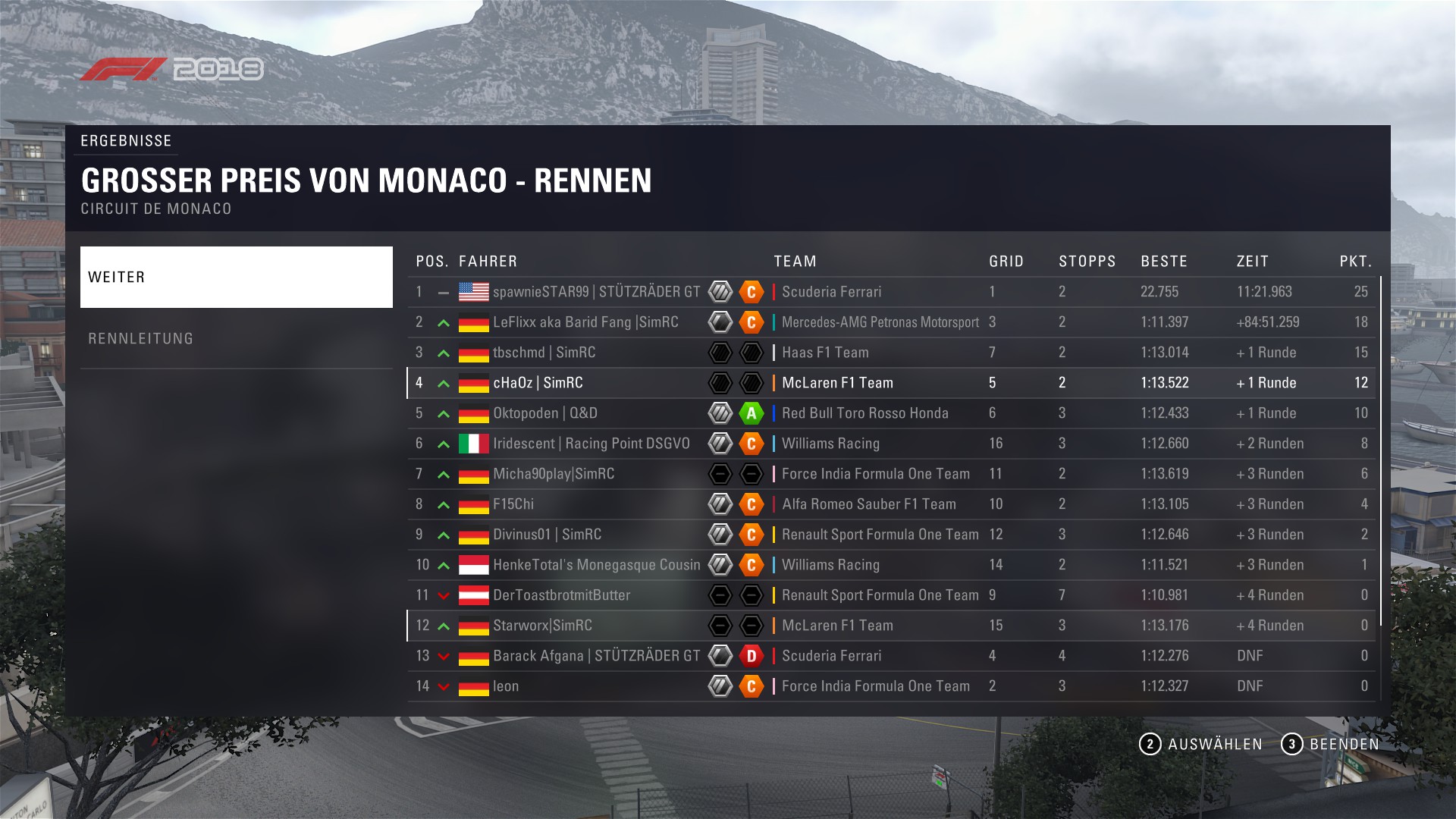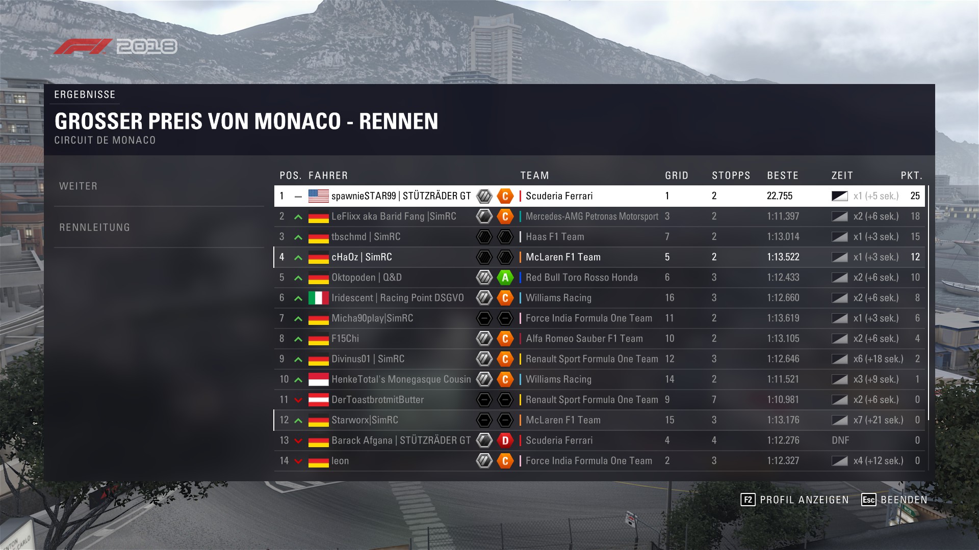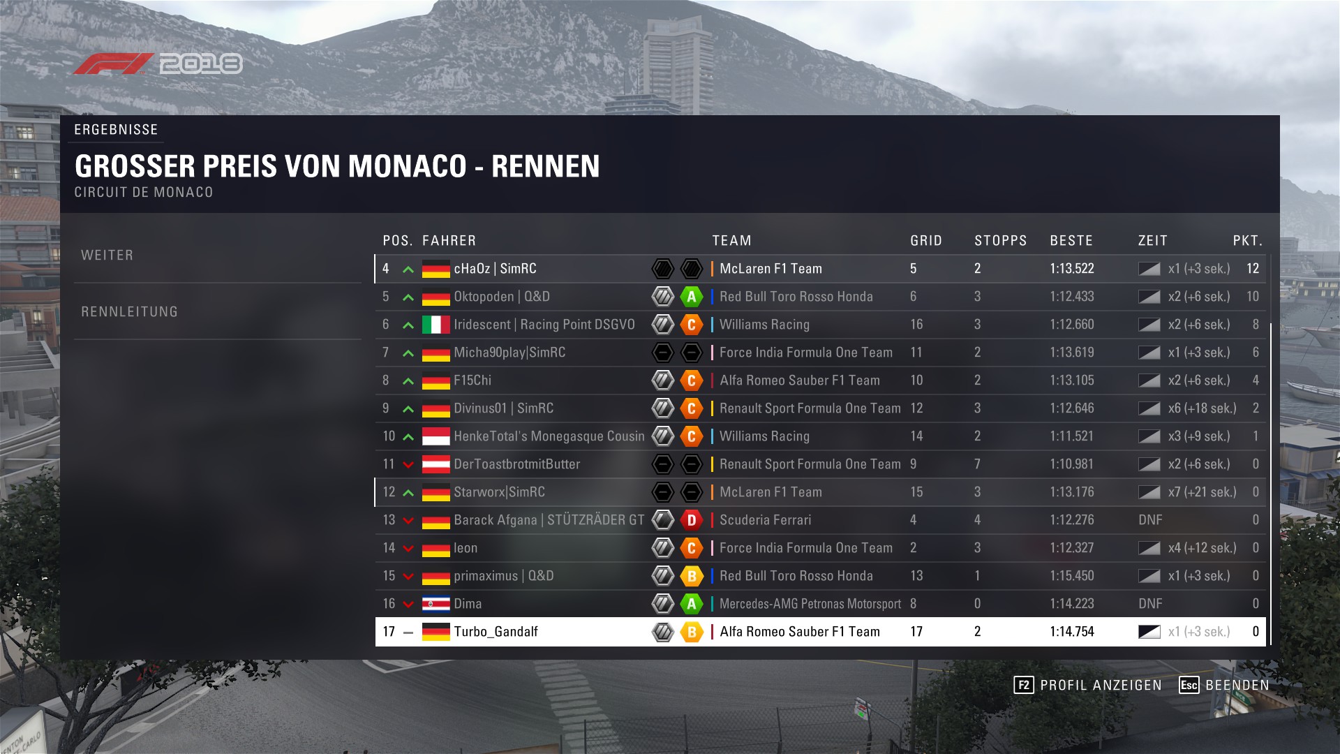 ) Nach dem ersten Stopp dann irgendwann mit einem relativ... sagen wir mal "starken" Manöver den Berg hoch überholt. Dann fing das Debakel richtig an. Flügel ab da, Stop. Flügel ab dort, Stop. Solange ich den Flügel behalten konnte hatte ich jedoch eine absolut geile Pace und konnte auf jeden aufholen... solange bis es wieder BUTZ gemacht hat. Daher würde ich sagen ich hab den SimRC Boxenstoppaward Monaco-Edition (Trademark) absolut verdient geholt! Sonst gab es nicht mehr viel zu berichten, hab anscheinend ein paar Leute verärgert, (Tut mir Leid Leude).