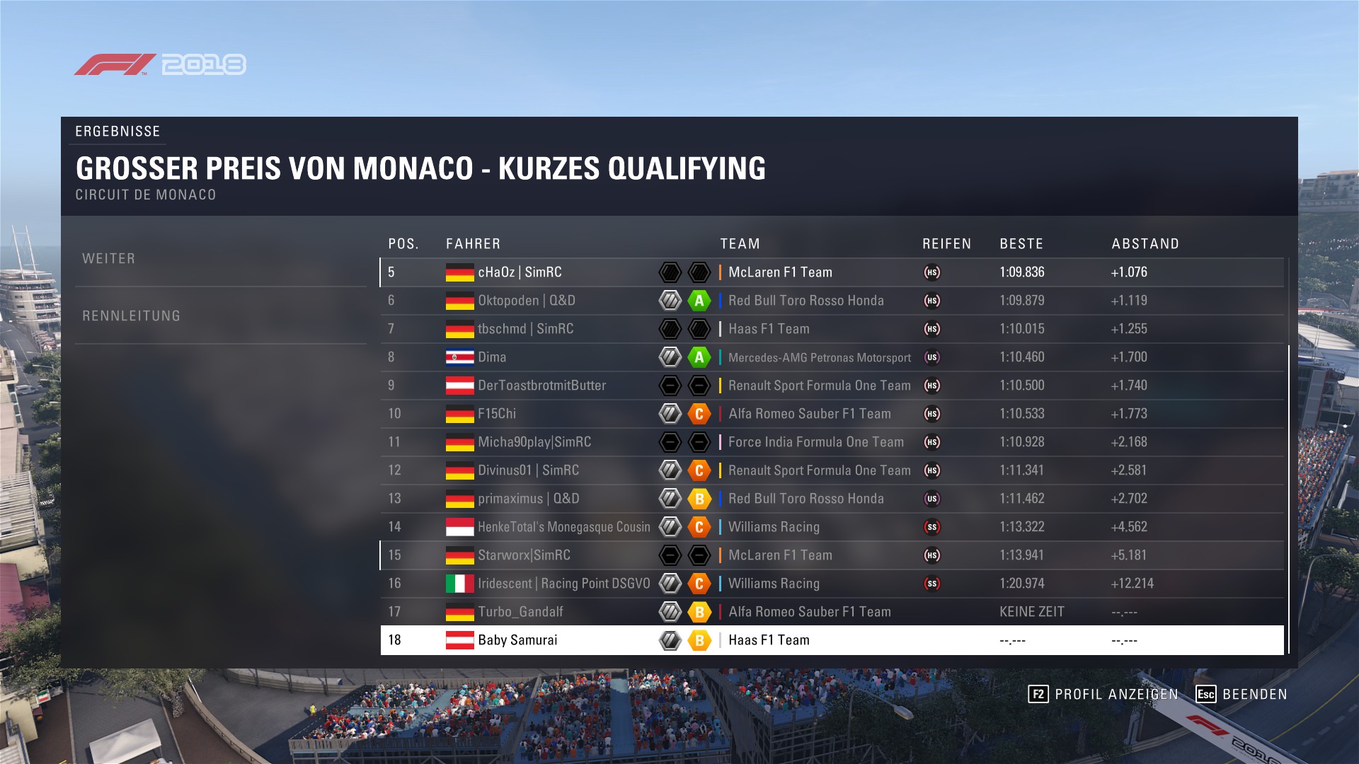[PC F1 18.1-Sunday] 6. Ligarennen | Monaco GP | Rennberichte