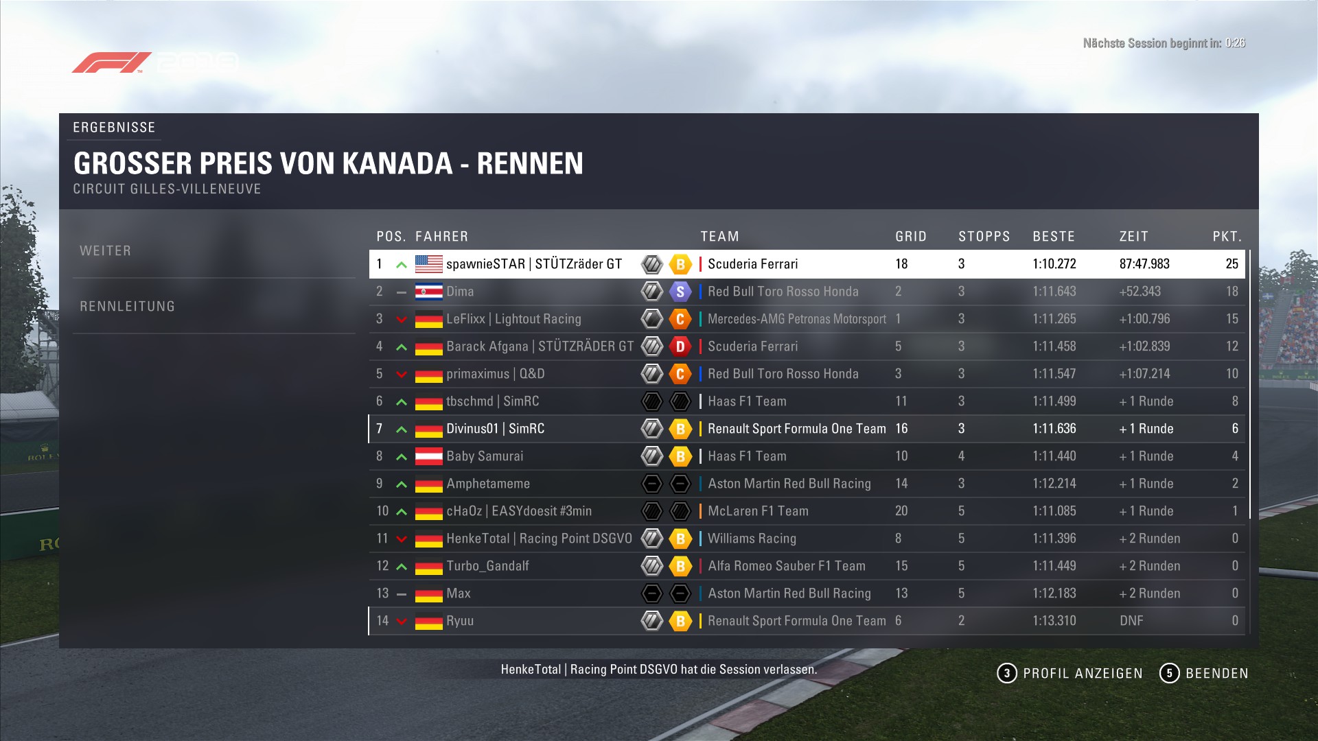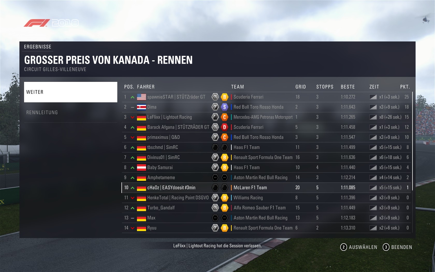 Rennen: Kurzer Text zum Rennen (Vorfälle, besondere Überholmanöver, Gedanken zu Boxenstopps, Undercuts usw.)