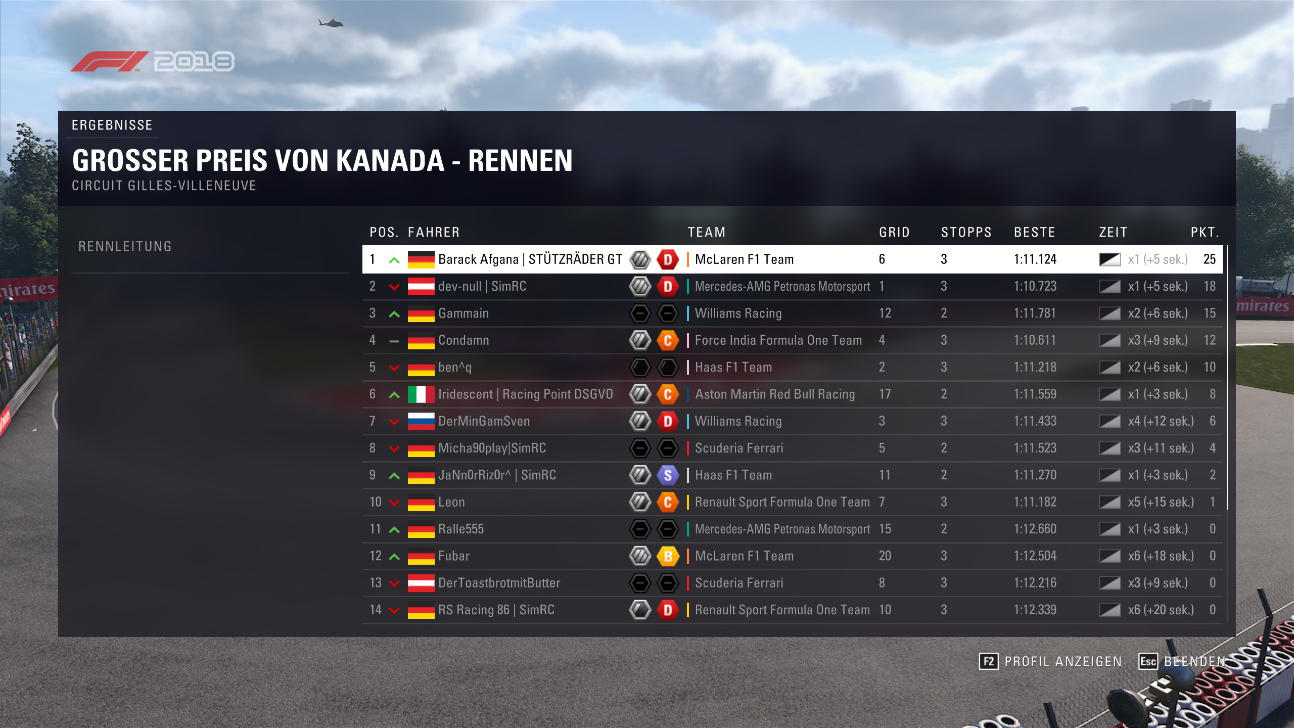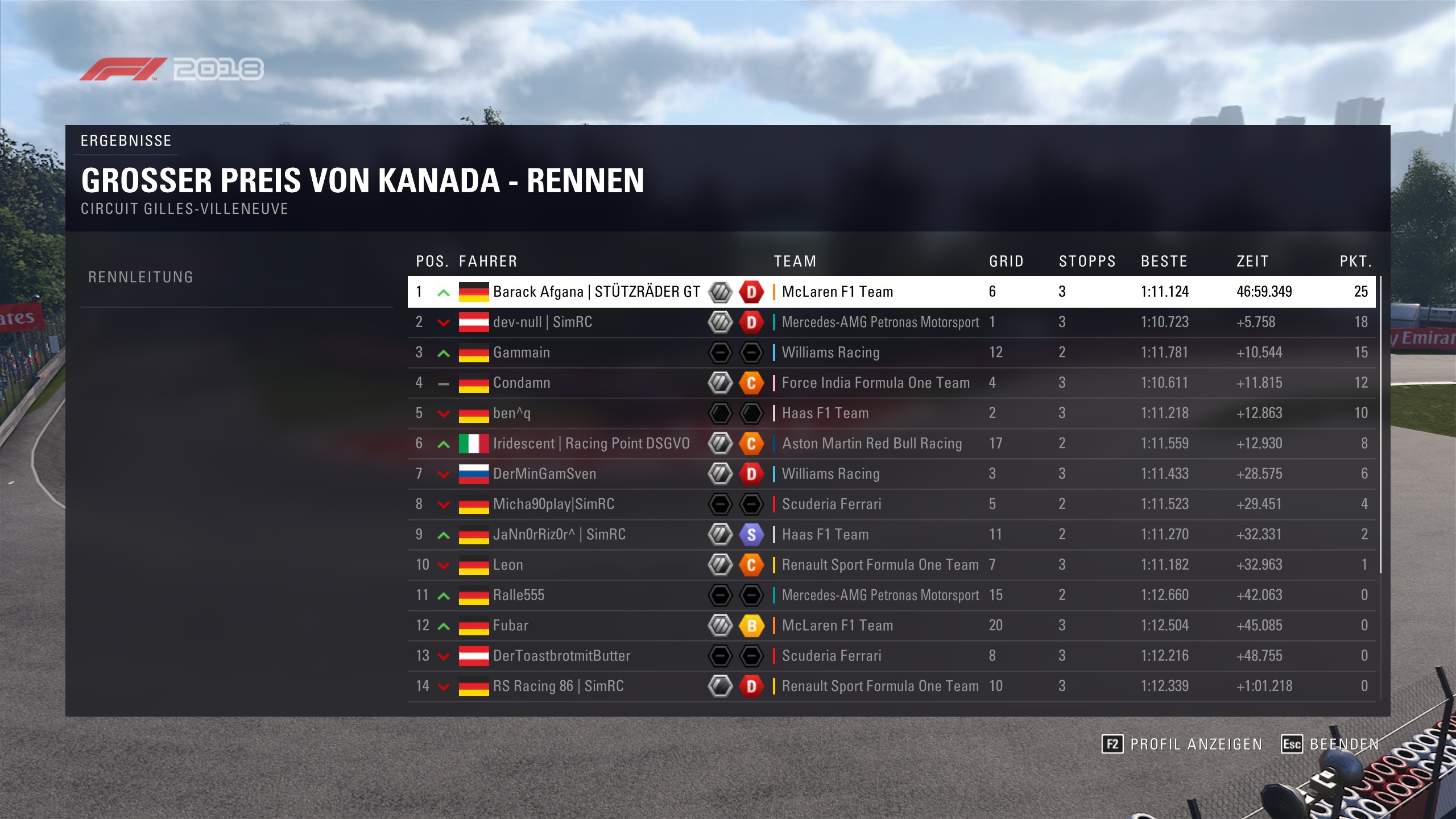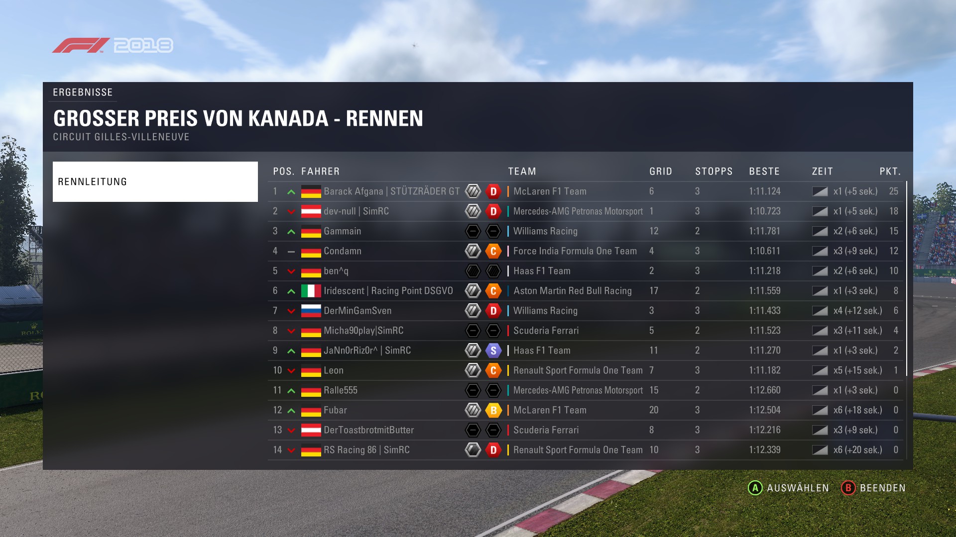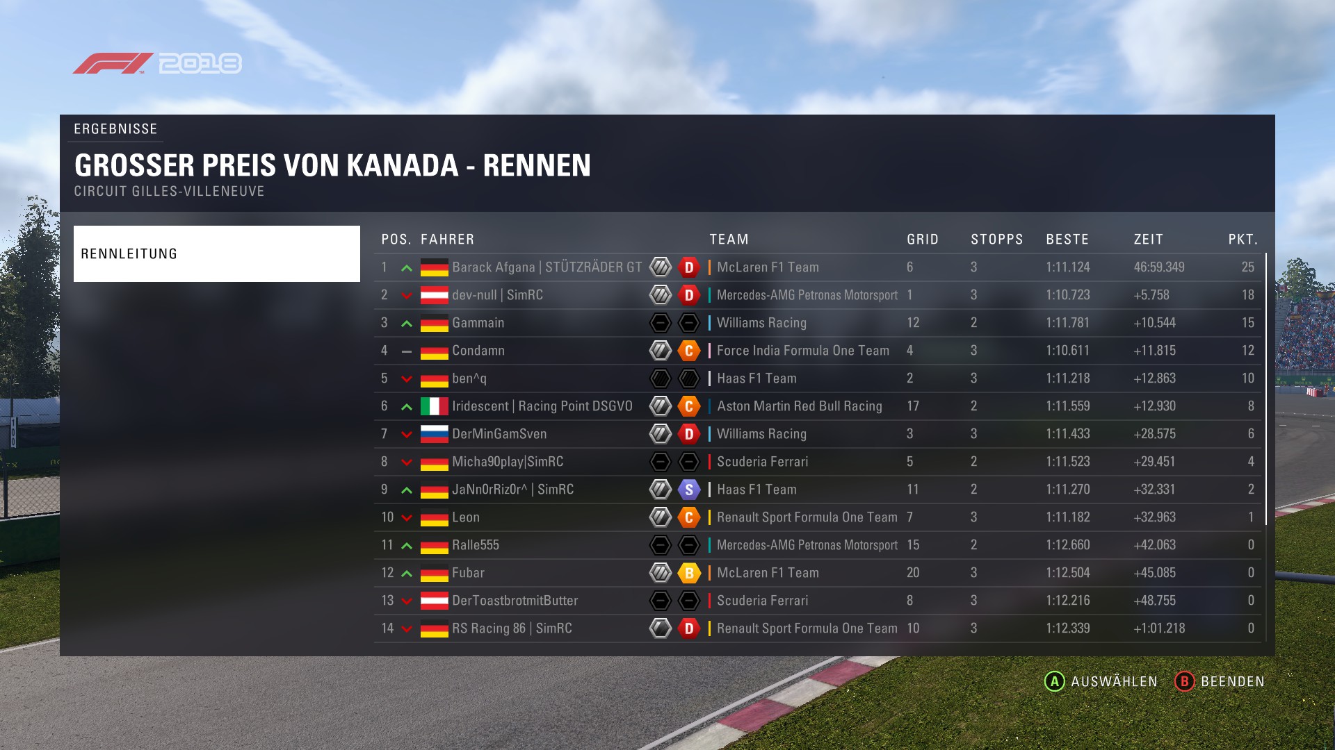 Rennen: Kurzer Text zum Rennen (Vorfälle, besondere Überholmanöver, Gedanken zu Boxenstopps, Undercuts usw.)