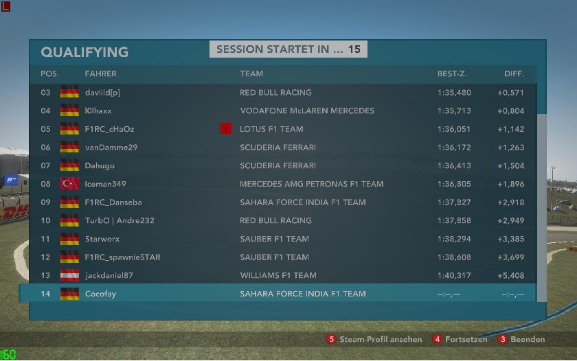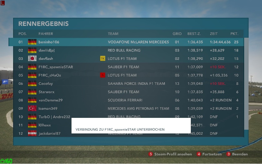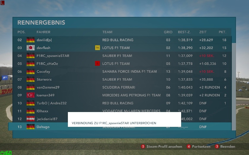 Wieso mein PC gecrasht ist, ist mir leider ein Rätsel. Ich werde beim nächsten Rennen freiwillig als letzter starten, um so etwas zu vermeiden, zudem versuch ich herauszufinden was mein PC an Online Rennen mit so vielen Spielern nicht mag.