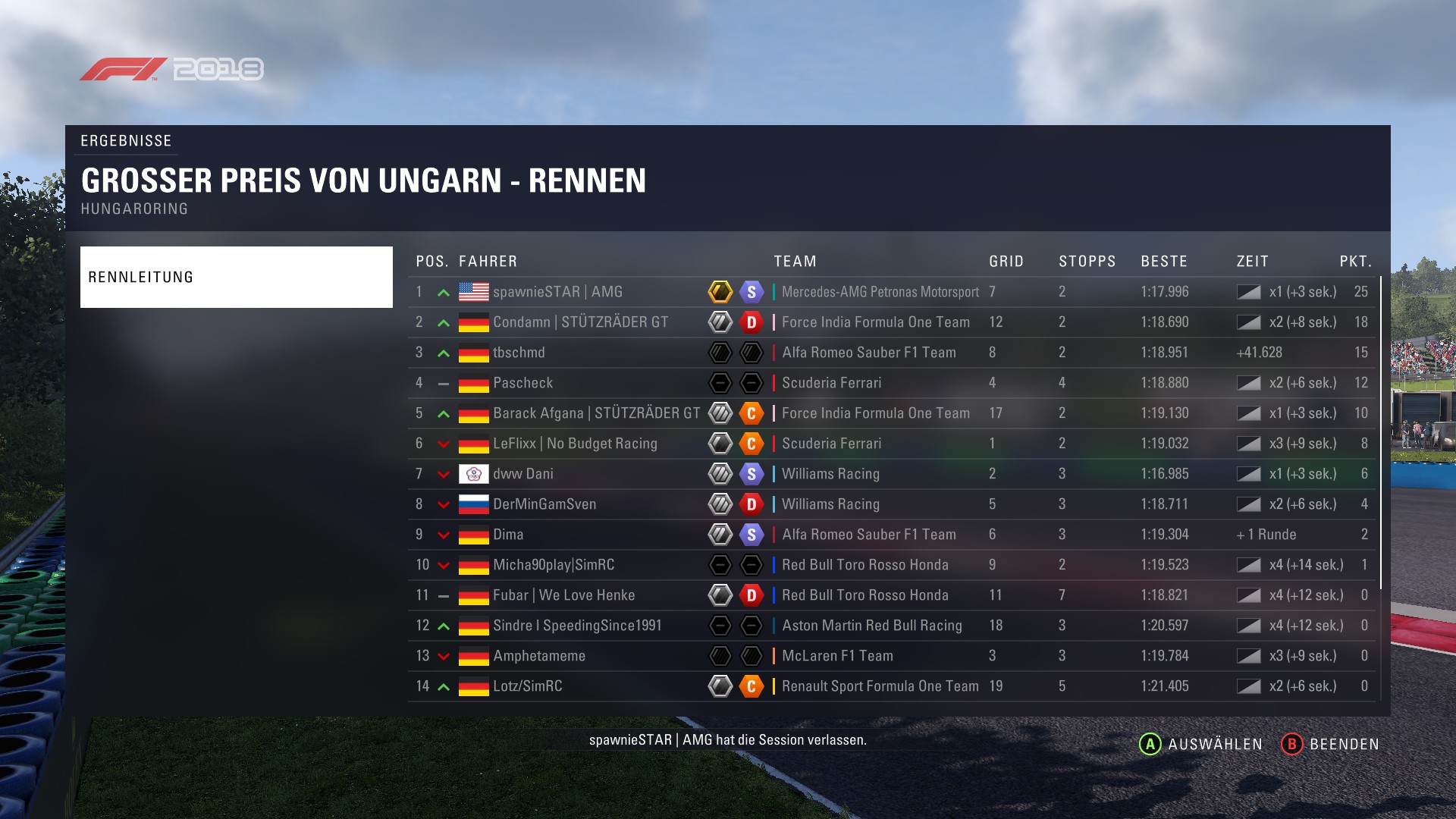 Fazit: Ohne den Unfall wärs vielleicht ein ein wenig spannenderes Rennen geworden, aber ein paar Punkte hab ich noch mitgenommen und bin deshalb jetzt auch nicht sauer oder sonstiges. Ungarn ist eh ne kack Strecke :lul: