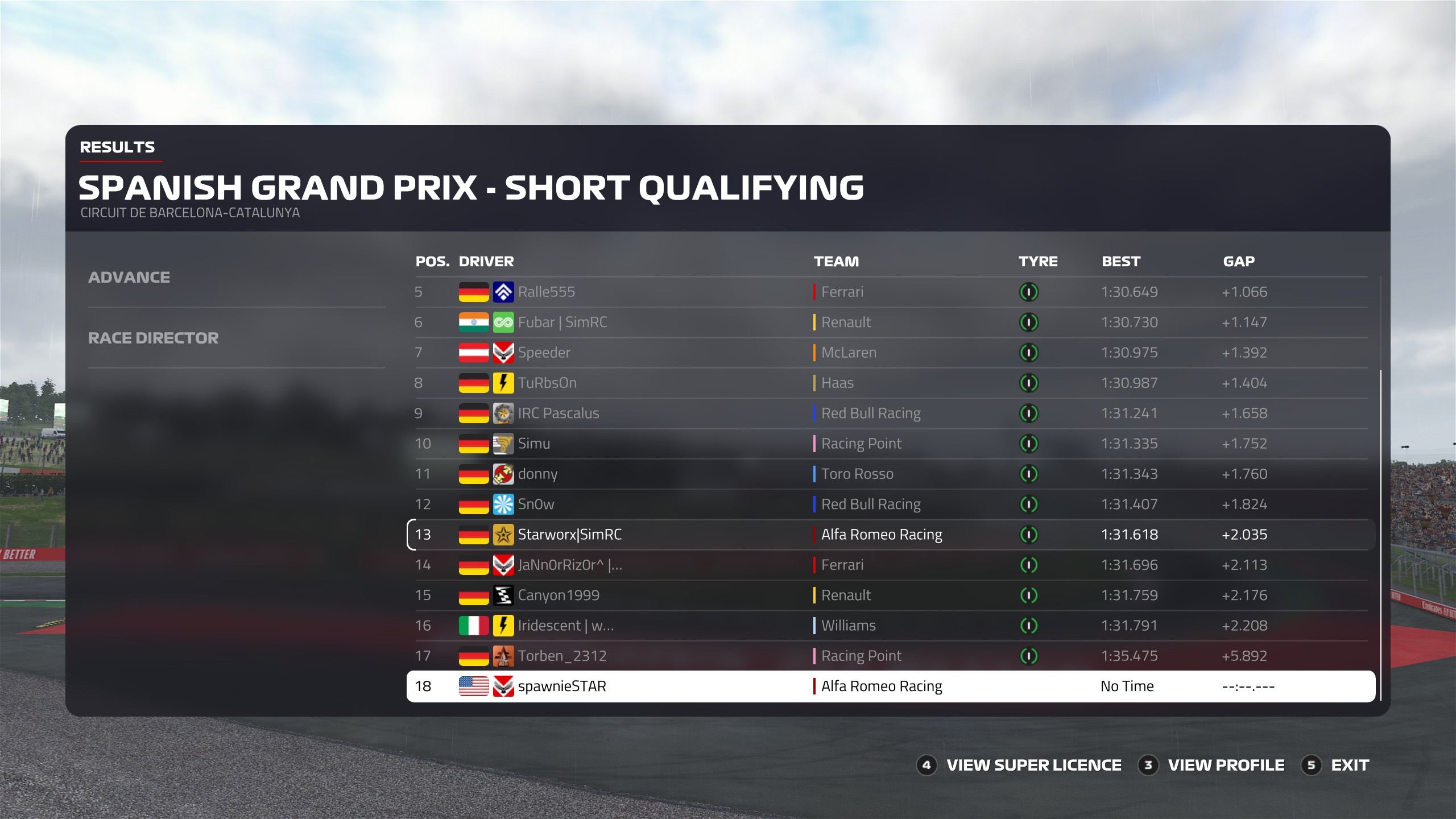 Jetzt zu der Szene die spawnieSTAR angesprochen hatte. Ich habe dich schon gesehen, dass du aus der Box kamst. Habe mich wohl ein wenig verschätzt. Ich dachte du wärst noch "relativ weit" weg gewesen. Habe dich in Turn 4 ziemlich dicht hinter mir gesehen, worauf hin ich dich in Turn 5 vorbei gelassen habe. Eine blaue Flagge wurde mir dennoch nicht gezeigt. Ich möchte mich bei dir an dieser Stelle Entschuldigen. Ich hätte dich definitiv früher vorbei lassen sollen. Tut mir wirklich leid. Werde versuchen, dass das nicht noch mal vor kommt.