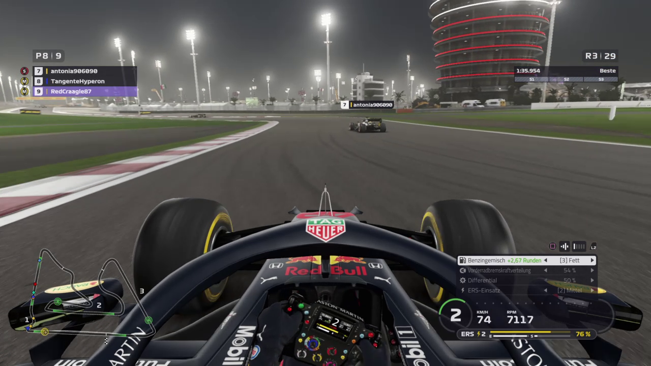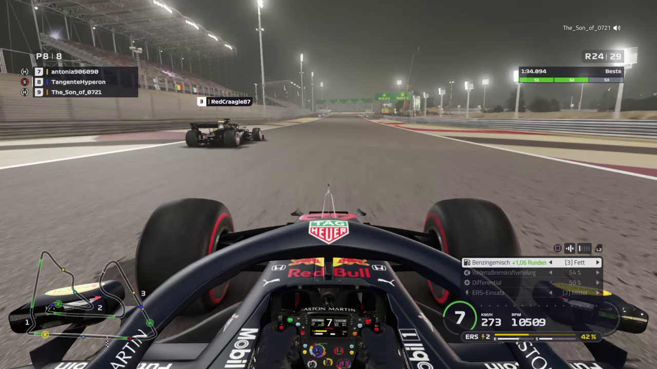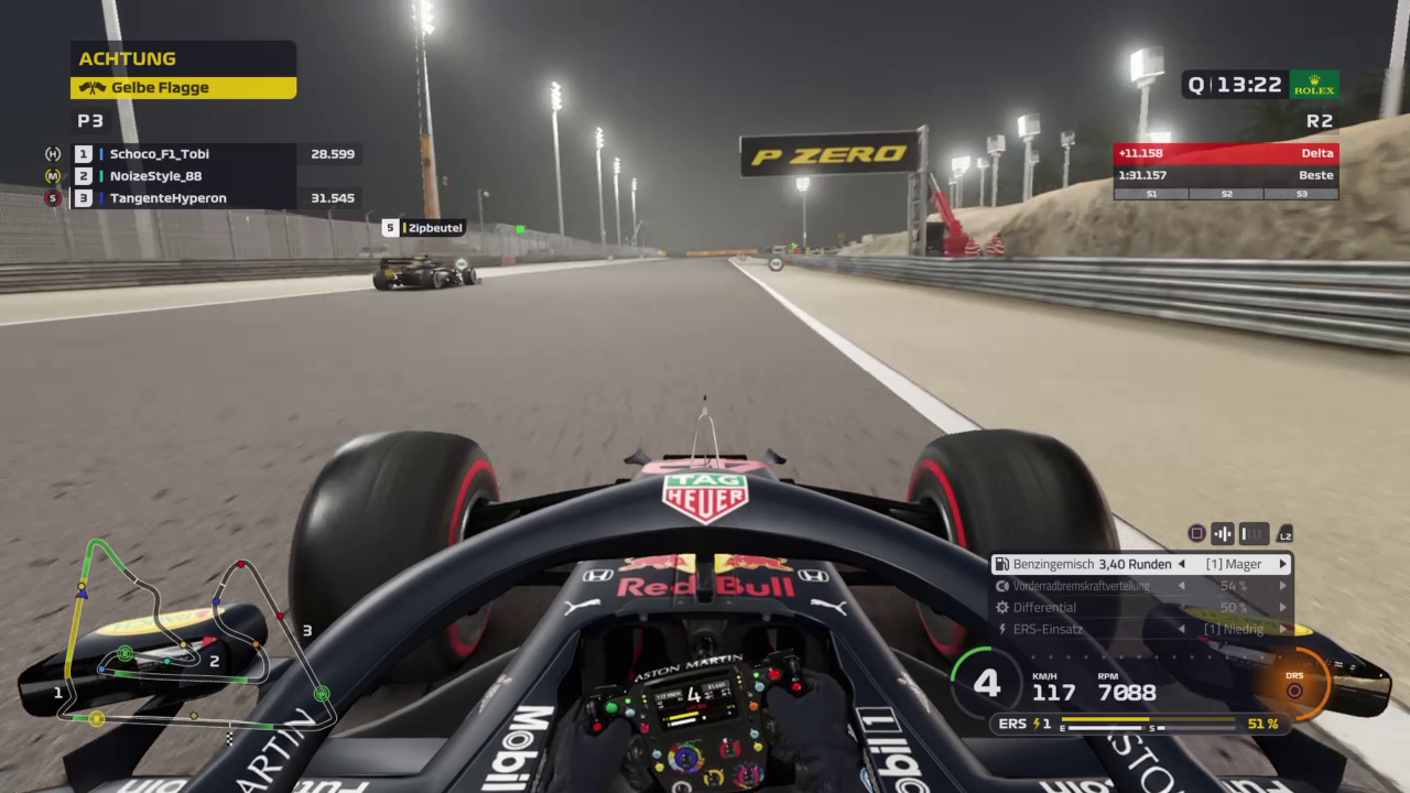 Ich drehte mich zudem so blöd weg, dass ich knapp vor der Wand zu stehen kam, musste also erst einmal wenden. Mein Dashboard zeigte mir nach Sektor 1 knapp 22sec Rückstand auf die Spitze an, das war kein schöner Anblick und das Rennen abgehackt. Habe dann diese erste Runde dazu verwendet den linken Hinterreifen wieder ins Fenster zu kriegen und ab dann gab es eigentlich nur noch volle Pulle. Wollte das Setup noch etwas testen, da ich es noch benötigen werde und daher gab es kein Zurückhalten. In Runde 10, als ich auf