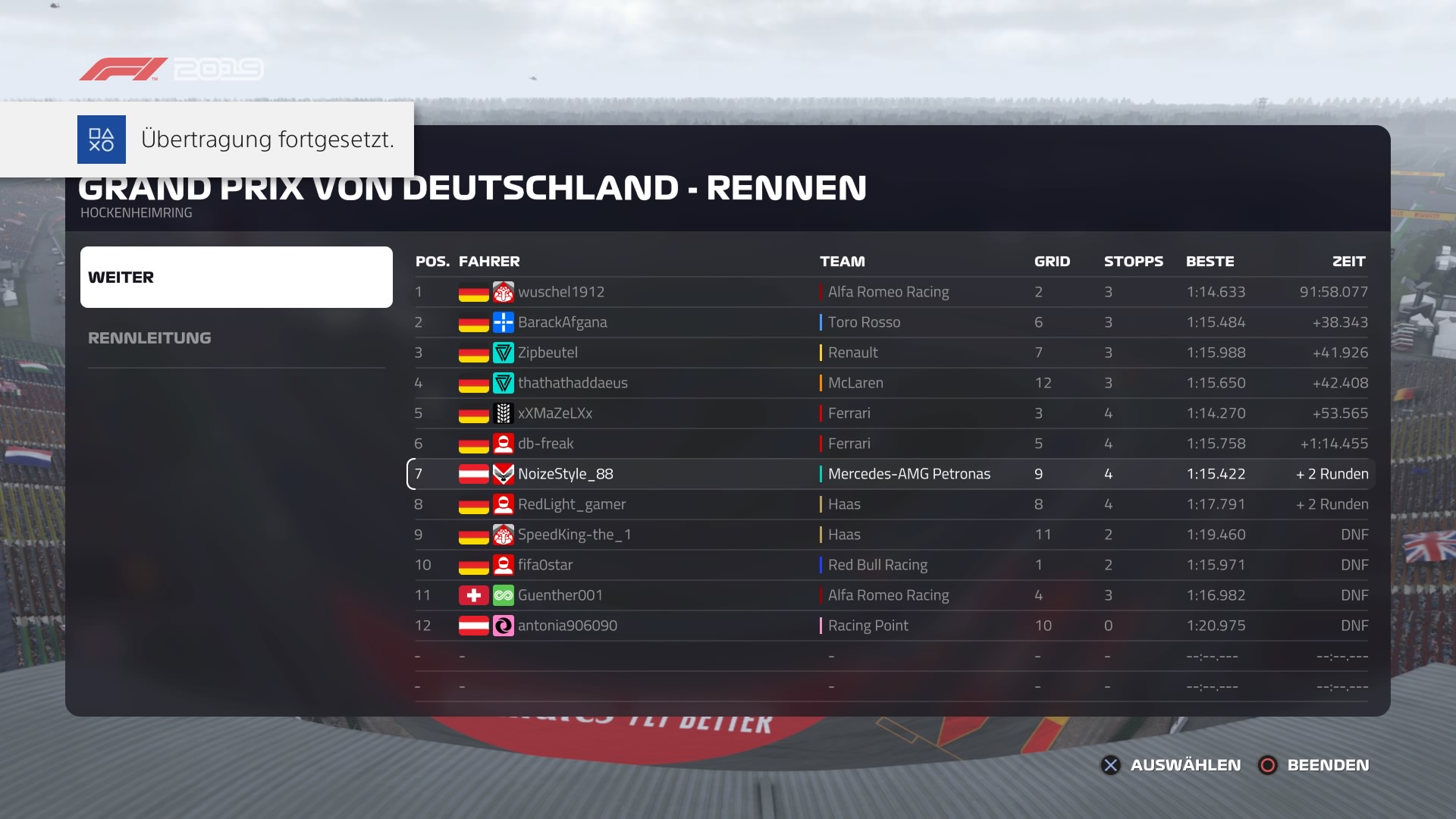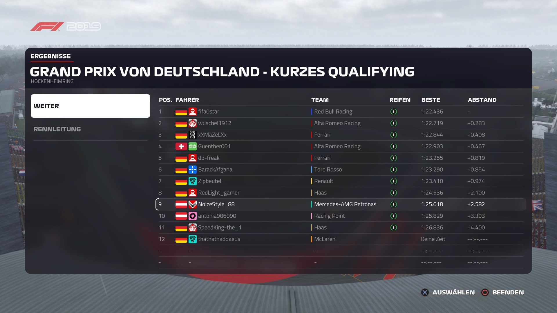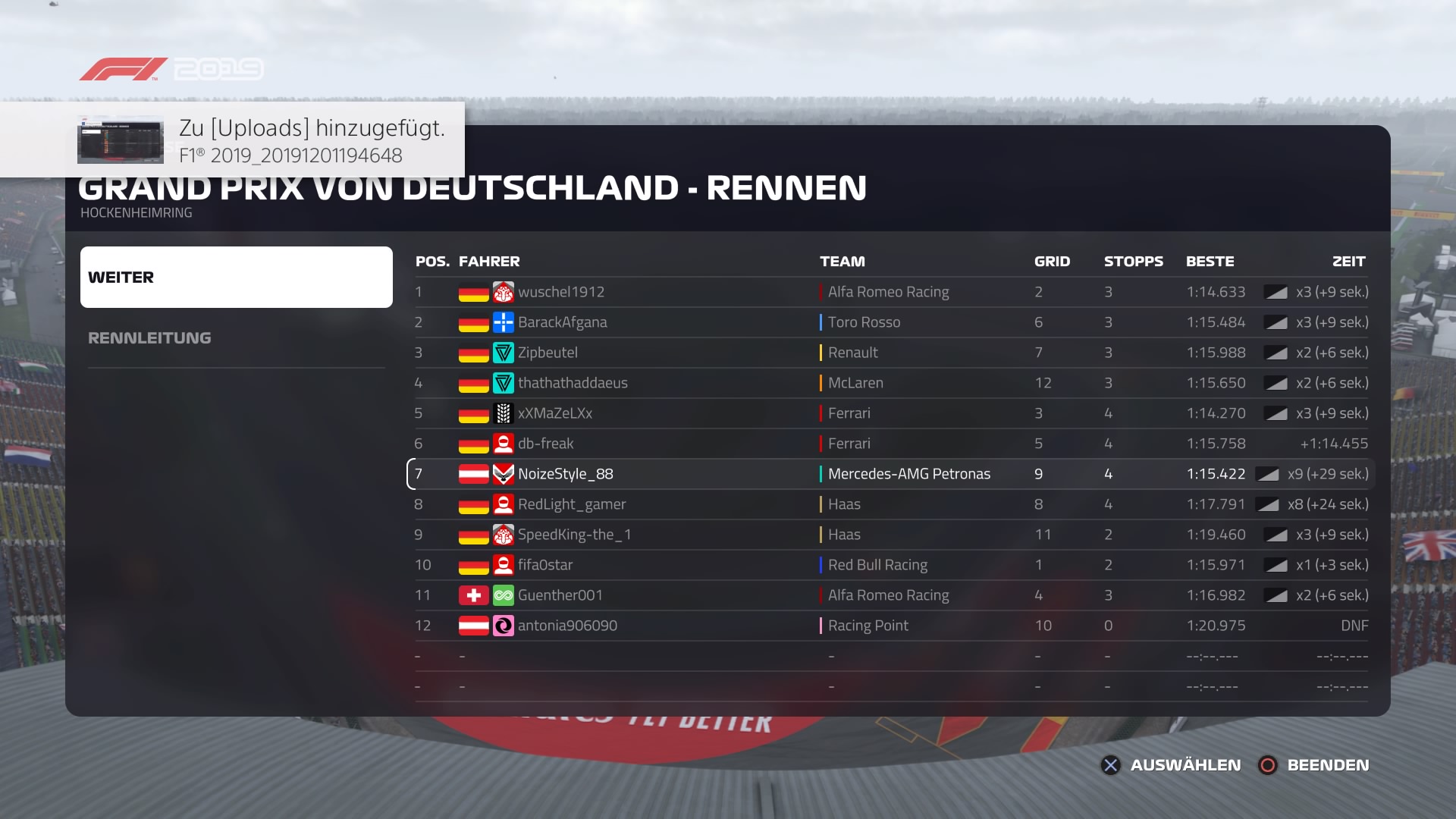 ) vorzeitig das Rennen und ich lag an P11. Vor mir mein Teamkollege etwa 8 Sekunden. Dauerte ne Weile bis ich dran war, Überholen ging recht simpel (Teamabsprache