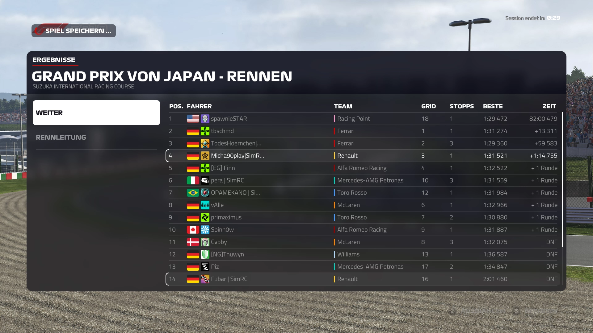 Rennergebnis: Endplatzierung im Rennen (z.B. 5)