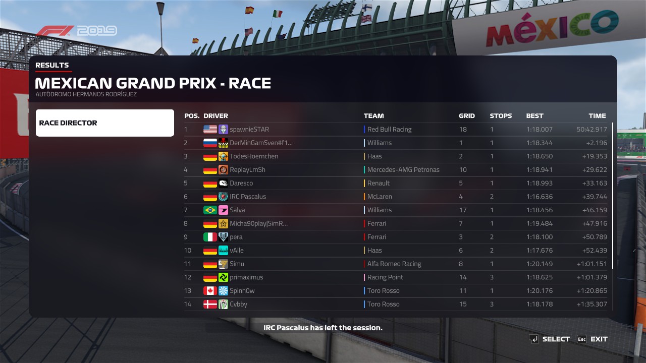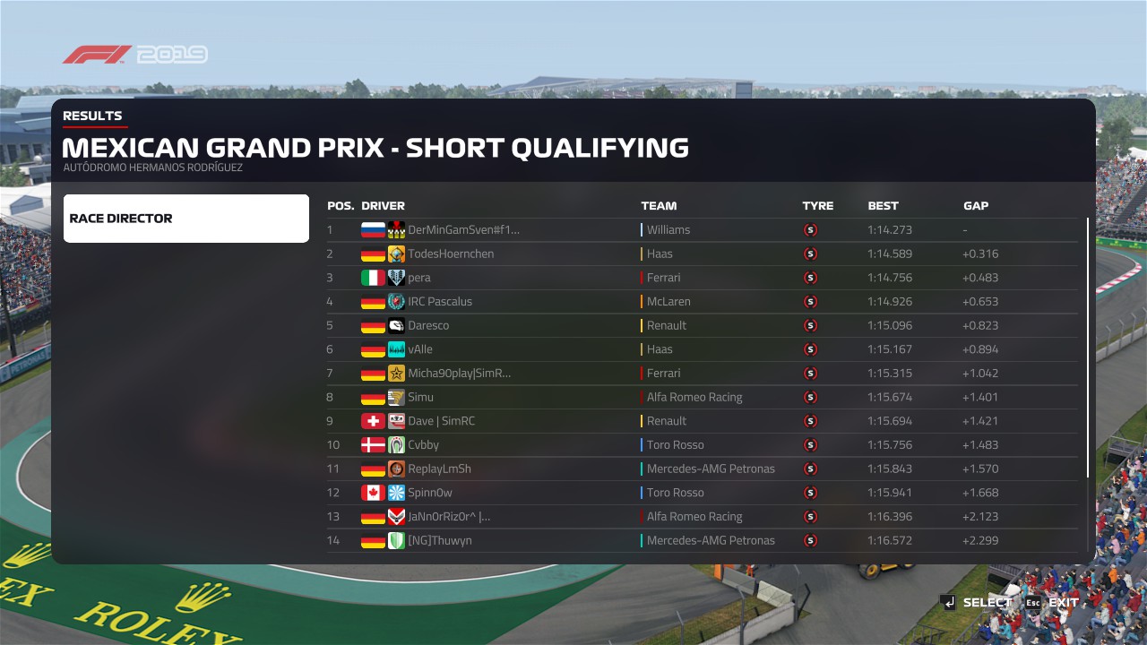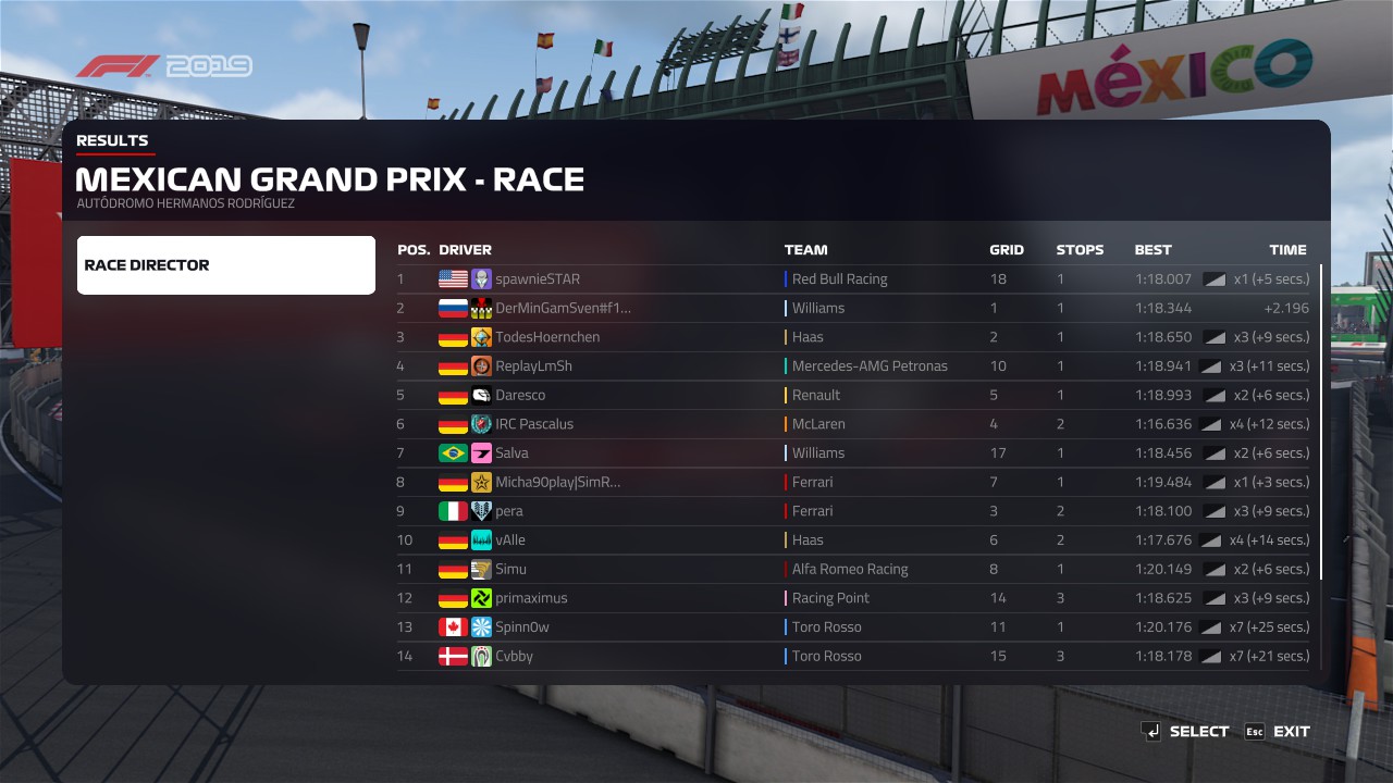 Rennen: Den besten Start überhaupt gehabt. Von P15 auf P7/8 nach der ersten Schikane. Bis zur Linie auf P12 vor und durch den ganzen Windschatten bis Turn 1 an alle rangekommen und außen in T2 gewesen und einfach gerade über die Wiese T3 gecuttet, um nicht in den crash verwickelt zu sein. Danach gut mitgehalten auf P5 vor. Dann Flügel außen in der Starworx Kurve kaputt gemacht und in die Box gefahren ( leider zu früh). Nachm 2ten Safety Car noch gut nach vorn auf P5 kommen können, aber im Fight mit @Salva in T4 verbremst und wieder nach hinten gefallen. Runde 24 wieder den Flügel kaputt gemacht in der Starworx und auf rot gewechselt, gehofft, dass ich noch an den langsameren Hards vorbeikommen kann. Hätte nur für P11 gereicht, also vorletzte Runde in die Box versuchen jemandem die schnellste Runde zu klauen (ich hab zu dem Zeitpunkt gedacht, Valle hätte die). spawnieSTAR kam leider vor mir raus, der in der letzten Runde war. Wurde aber nach der Flosse durchgelassen. Runde war dann in Ordnung, aber zu viele Fehler gemacht und in der letzten Kurve hatte ich kein Benzin mehr, somit wurde es nichts.