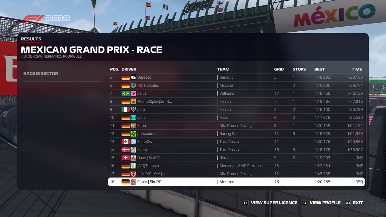 Rennen: Rennen habe ich mir 2x selber verhauen. Erst als ich Ausgang Kurve 15 zum Stadion hinaus mein Auto wiedermal in die Wand schmiss, nachdem ich den Kurb zuvor schlecht genommen habe. Dann die verunglückte Divebomb gegen @Daresco , bei dem ich @Fubar am Heck erwischte.
