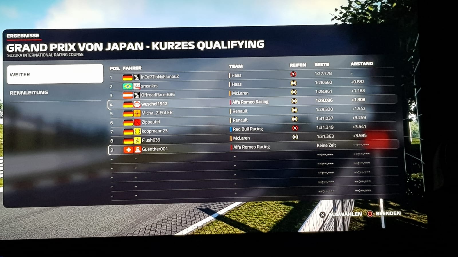 Rennen: Richtig schlechten Start gehabt, wie Leclerc auch in Japan. Schon vor der ersten Kurve 2 Positionen verloren und am Ausgang der ersten Kurve in die Wand gedreht... uff. Flügelschaden und dann Box. Danach dreht sich Micha Ziegler am Ausgang der SS's. Icj kann nicht mehr ausweichen und roter Flügel. Here we go again. Dann noch ne Durchfahrtsstrafe bekommen, da ich beim restart eines VSC zu schnell war... hab mich auf den Hards mit OFFROADRACER686 durchs Feld gekämpft und konnten somit P1 und P2 holen. Allerdings nur, weil Simon sich bedauerlicherweise in den SS's zerlegt hat. Er hätte absolut verdient gewonnen!