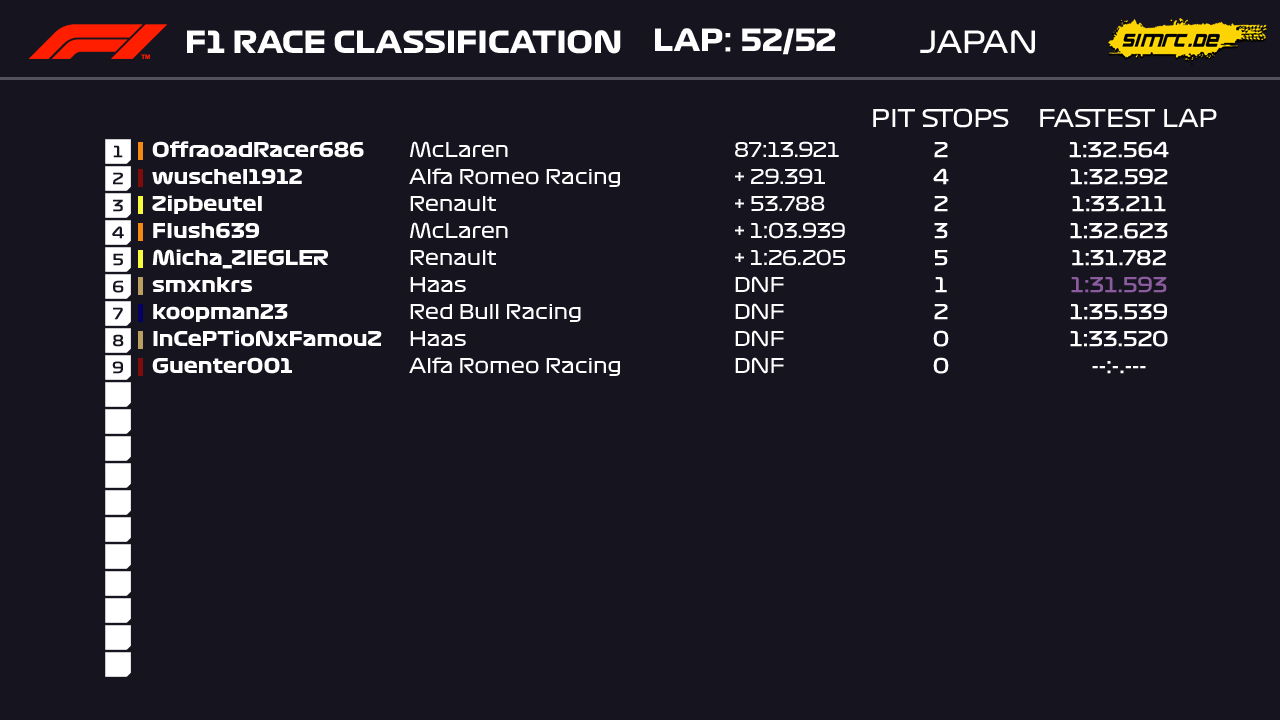 Rennen: Start eigentlich gut weggekommen und fuhr hinter den beiden Haas her. Dann kam das Safty Car und dann kam es leider zu dem Vorfall mit Speedmaster den er ja schon beschrieben hat. Sry nochmal dafür, bist ja schließlich ausgeschieden. Musste dann eine Runde später rein weil es mit orangenen Flügel nicht geht hier schnell zu fahren. Hab auf die Hards gewechselt und bin dann bis zum Regen, der 5 Runden vor Schluss anfing, durchgefahren. Konnte dabei gemeinsam mit Marcel2502, der auch Anfangs sehr viel Pech hatte, richtig gute Rundenzeiten fahren und wegen den Fehlern von Simon sogar nach dessen Stopp die Führung übernehmen. Somit lagen Marcel2502 und ich, dir zwischenzeitlich letzte waren auf P1 und P2 und konnten auch so zuenden fahren weil sich Simon dann leider noch in den S-Kurven zerstört hat, echt schade, weil das wäre sonst nochmal richtig spannend geworden. Somit war es eigentlich auch ein unverdienter Sieg weil ich ja nicht der schnellste war.