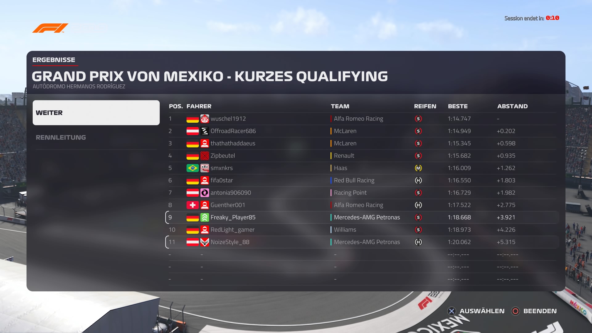 Haben sie das also gefixed. Ich bin dann direkt zweimal an die Box in R01 und R02 um den verpflichtenden Wechsel auf eine andere Mischung gemacht zu haben. Ich war also anfangs Runde 4 Letzter, aber hatte immerhin schon die andere Mischung gefahren. Bei meinem schlechten Speed muss ich einfach so viel wie möglich auf den Softs fahren, um mitzuhalten. Das gelang dann anfangs auch ganz gut. Gab einen schönen Vierkampf gegen Olly, fifa und Antonia. Natürlich konnten sich Fifa und Antonia durch- und danach absetzen. Olly fiel hinter mir zurück, den sah ich heute als größten und einzigen Gegner. Dann kam aus heiterem Himmel und ohne Grund ein VSC. Tja, das hatte ich noch nicht und deshalb wusste ich auch nicht so genau wie das mit der Zeitvorgabe geht. War viel zu schnell und erhielt direkt 2x Drive Through. Bevor ich die abgesessen hatte, hatte ich noch die beiden Alfas hinter mir, hielt Wuschel ne zeitlang auf. Sorry, war so nicht vorgesehen