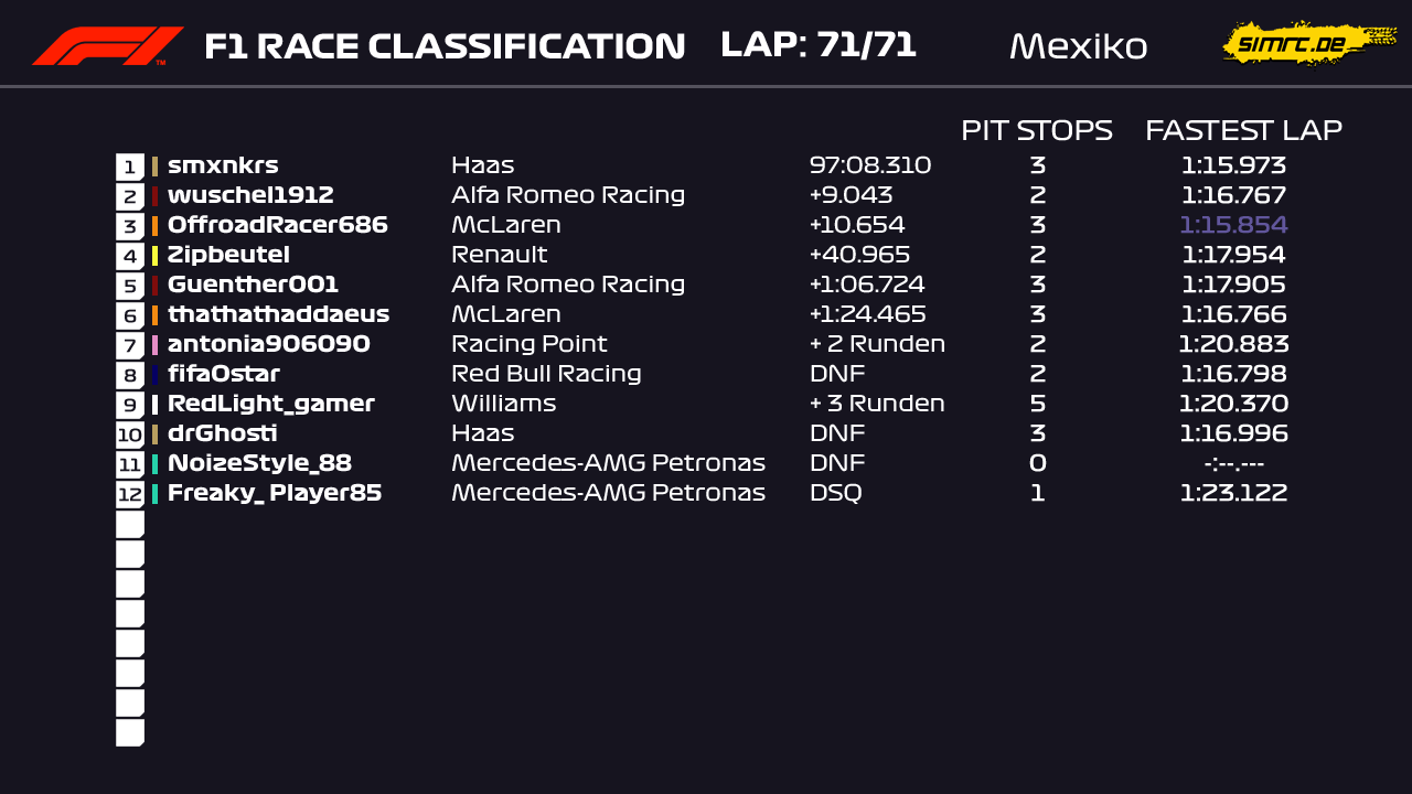 Der einzige Fahrfehler, der mir unterlief war in Runde 65 ein Dreher im Kurvengeschlengel, wodurch ich nochmal einen zusätzlichen Stopp einlegen musste. Ich gewann noch einen Platz durch den Ausfall von drghosti. Fifastar fiel auch noch aus, aber hatte zu viele Runden Vorsprung, so dass es dann bei P9 blieb, womit ich aber sehr happy bin!