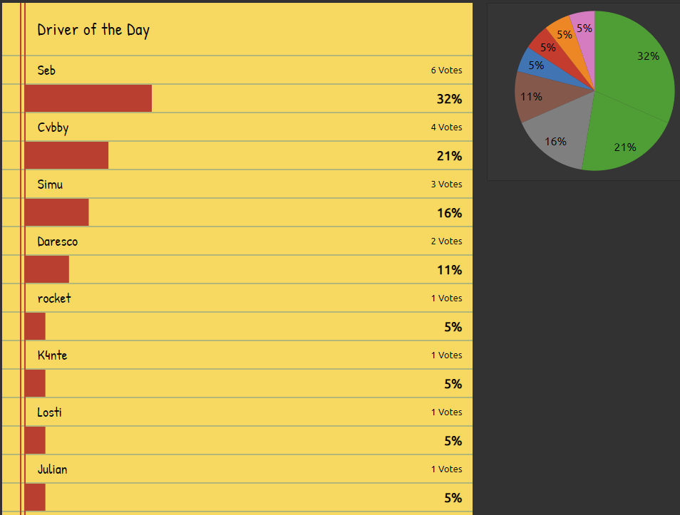 Rennen: Kurzer Text zum Rennen (Vorfälle, besondere Überholmanöver, Gedanken zu Boxenstopps, Undercuts usw.)