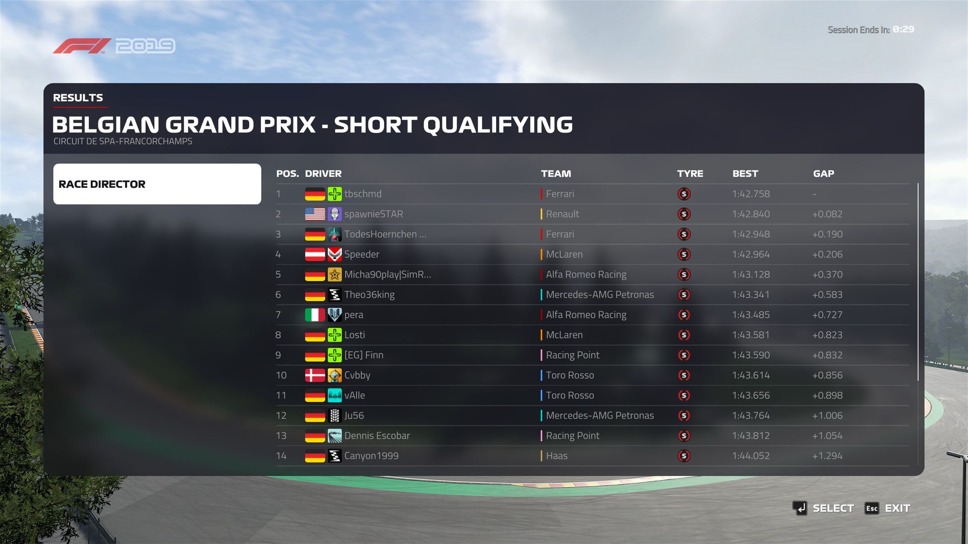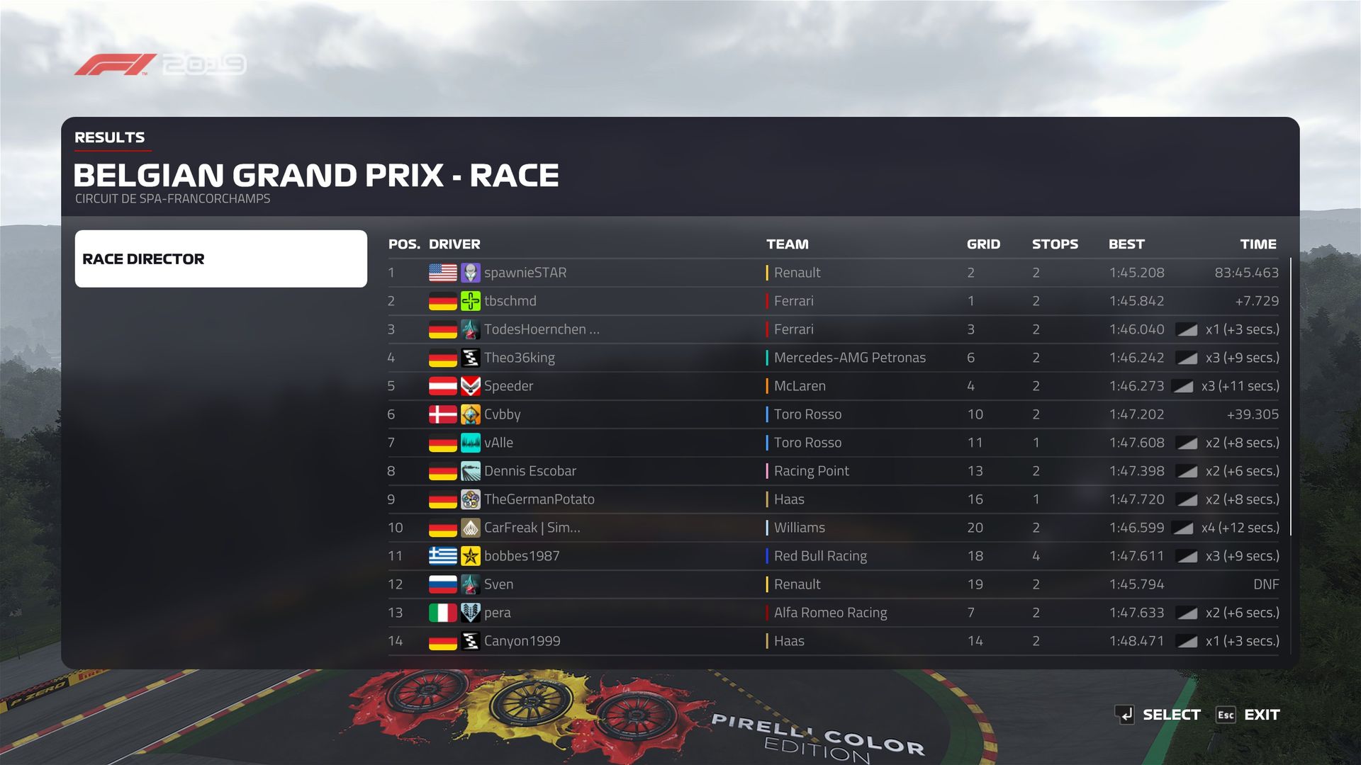 Rennen: Anfangsphase war eigentlich gut und dann das ganze Rennen mit dem ERS gekämpft. Irgendwie ist bei mir in Spa ein bisschen der Wurm drin. Am Ende dann aber noch zufrieden auf P2. Spawnie war spätestens nachdem er auf Controller geswitcht ist weggefahren.
