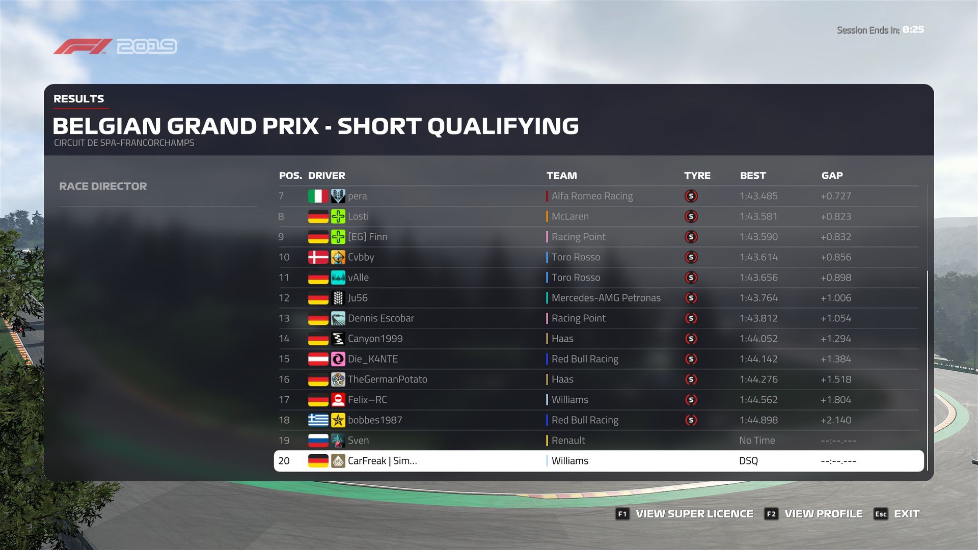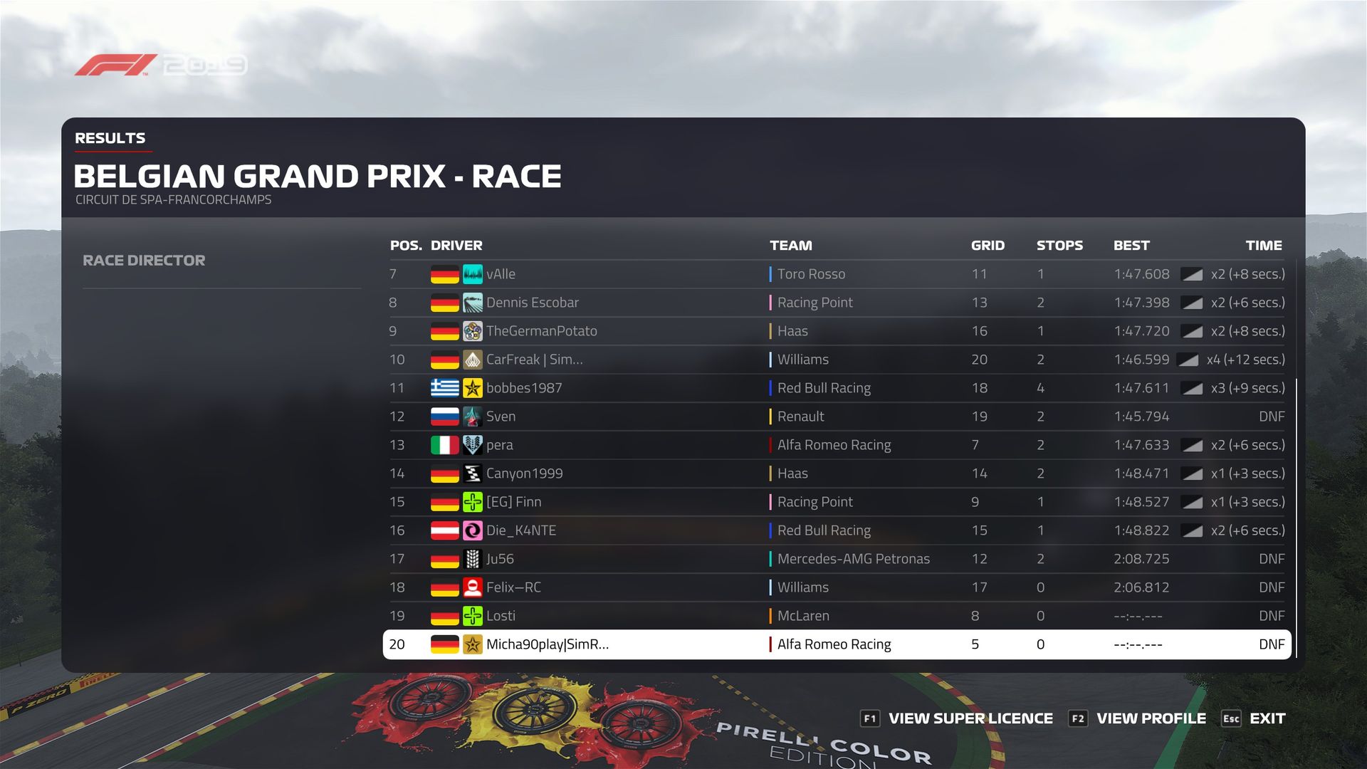 Rennen: Start nicht der Beste. Valle macht innen zu und ich muss T1 außen nehmen. @Canyon1999 dreht mich dann an meinem rechten Hinterrad nach rechts in @Felix-RC rein und ich habe eine Flügelschaden. Richtung Eau Rouge dann schon auf P19 zurück. Ende Camelstraight überholt mich @Ju56´s KI, während des VSC´s, aber ich kann wieder vorbei. Versucht mich dem kaputten Flügel irgendwie noch am Feld zu bleiben, aber ich konnte nicht die Pace der anderen mitgehen. Also dann mit dem zweiten VSC in die Box und Flügel gewechselt. R10 crasht mein Game. Bis ich eine Runde später wieder drin bin, verliere ich ~20 Sekunden aufs Feld und eine Position. Außerdem hat das Spiel dabei meine Zeit um 5 Sekunden verbuggt. Ähnlich wie Valle in Österreich. Bei dem Bug verschwanden auch Teile meines Overlays, sodass ich nie wusste, wie viel Zeit ich habe mein Delta zu korrigieren. Durch das SC wieder richtig hyped gewesen auf den letzten Stint auf Softs, weil ich und die Top 4 jeweils keine Strafen hatten. Im letzten Stint hatte ich auf den Softs auch eine deutlich bessere Pace als auf den Mediums. R29 drückt mich @Canyon1999 bei Blanchimont aufs Gras. R31 komme ich an @Canyon1999 vorbei und der stirbt kurz danach wegen CarFreak. R32 komme ich mit einem guten Manöver an @GermanPotato vorbei. R36 ziehe ich auf der Cammelstraight an pera vorbei, der einen Flügelschaden hat. Zum Ende der Rennens hin, arbeite ich mit Valle zusammen, damit er nach hinten einen genug großen Abstand hat, da er 8 Sekunden an Strafe hat. Durch den Bug mit meiner Zeit, bin ich am Ende im Ziel nur ~1 Sekunde hinter Autspeeder. Zum Ende hin habe ich leider nicht mehr volle Pace gefahren, da ich schon mit P6 zufrieden sein kann.