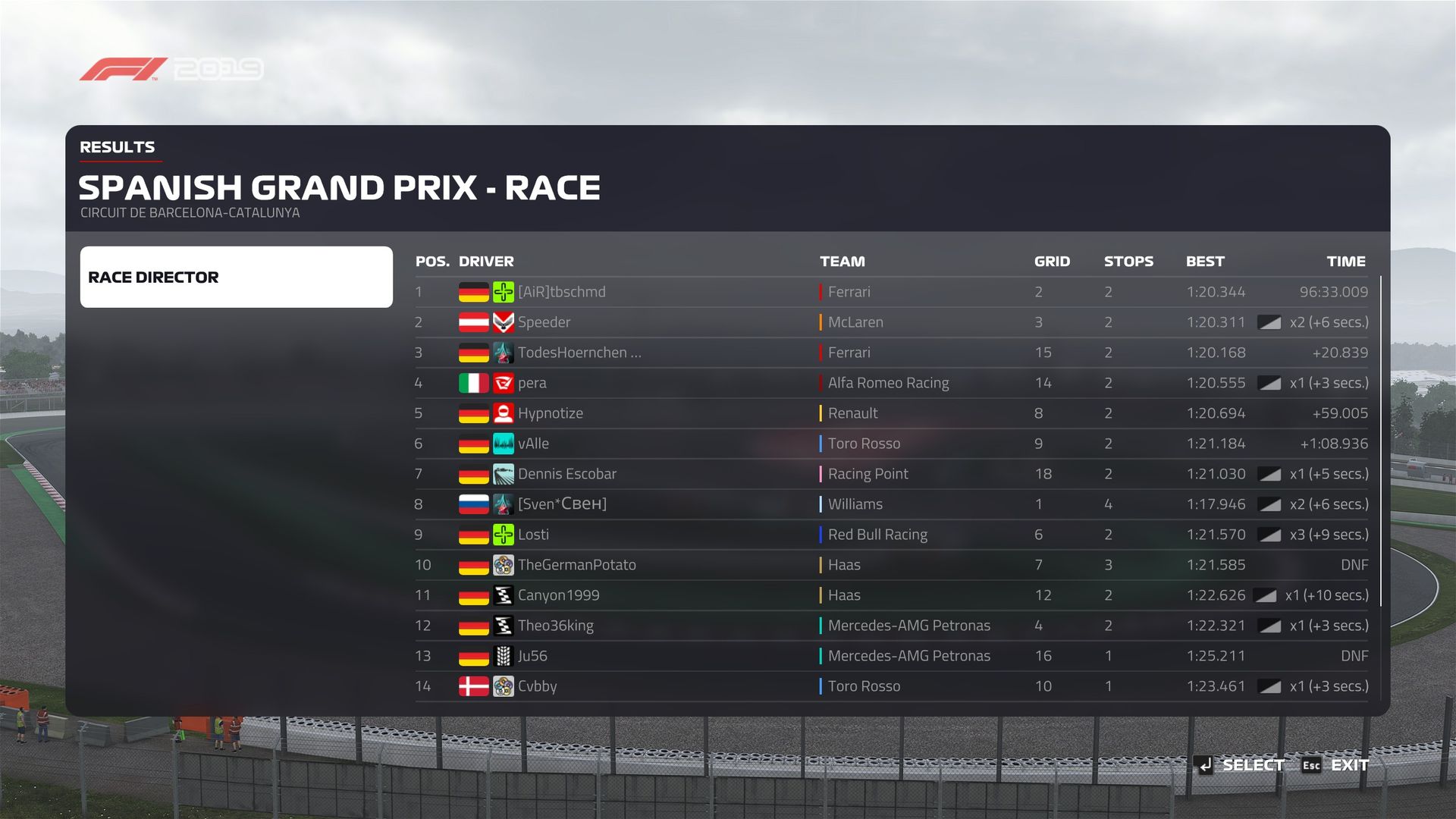 @GermanPotato vor mir auf der Strecke lag, ich dachte ich fahre vorbei, und er wollte im gleichen Moment noch Platz machen, naja Blöd gelaufen. Frontflügelwechsel und die zwei 5 Sekunden Strafen die ich komplett Grundlos während des SafetyCars bekommen habe (mit 10 kmh ne Kurve "geschnitten") haben mich dann viel Zeit gekostet. Konnte die restlichen Runden noch viele Sekunden auf